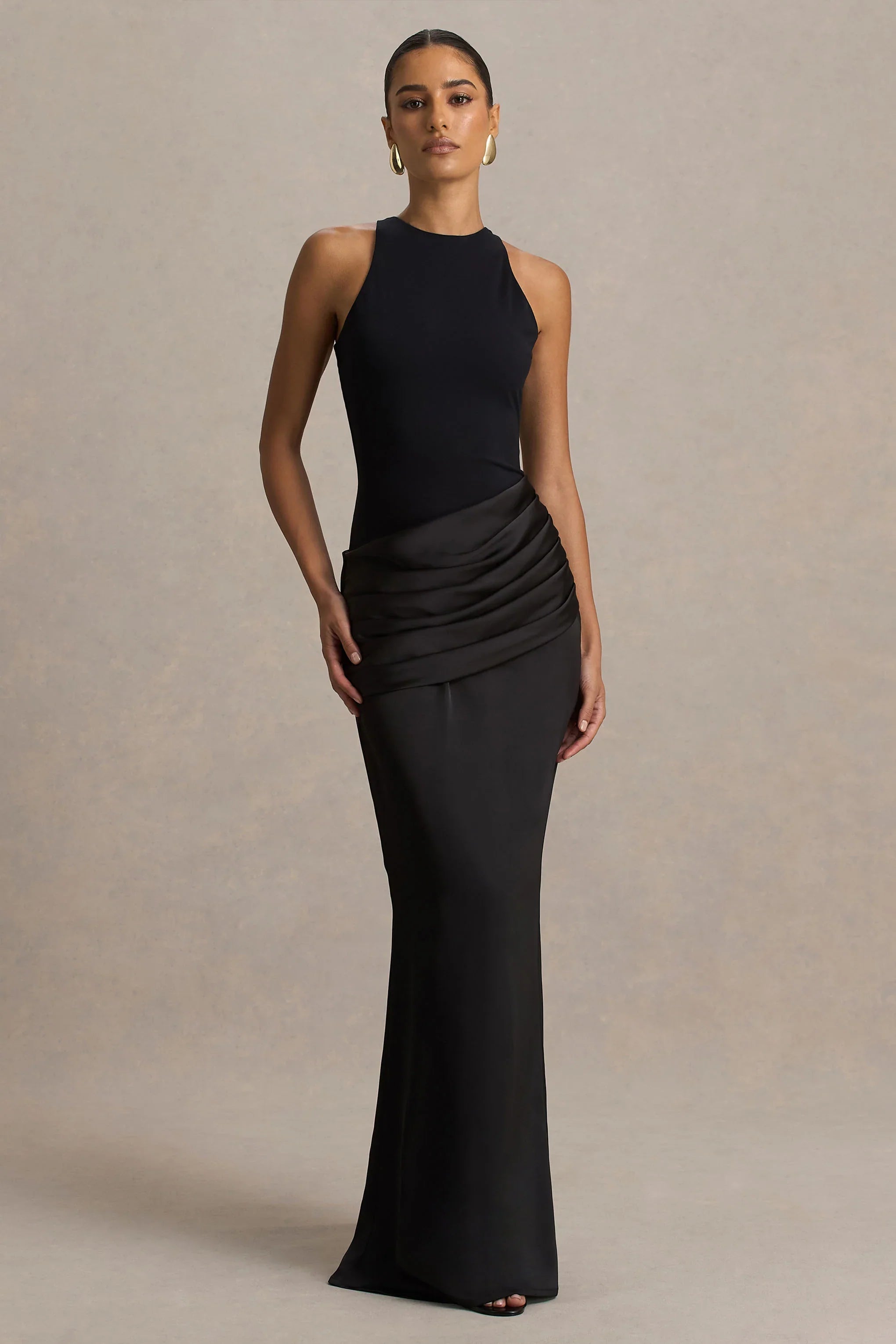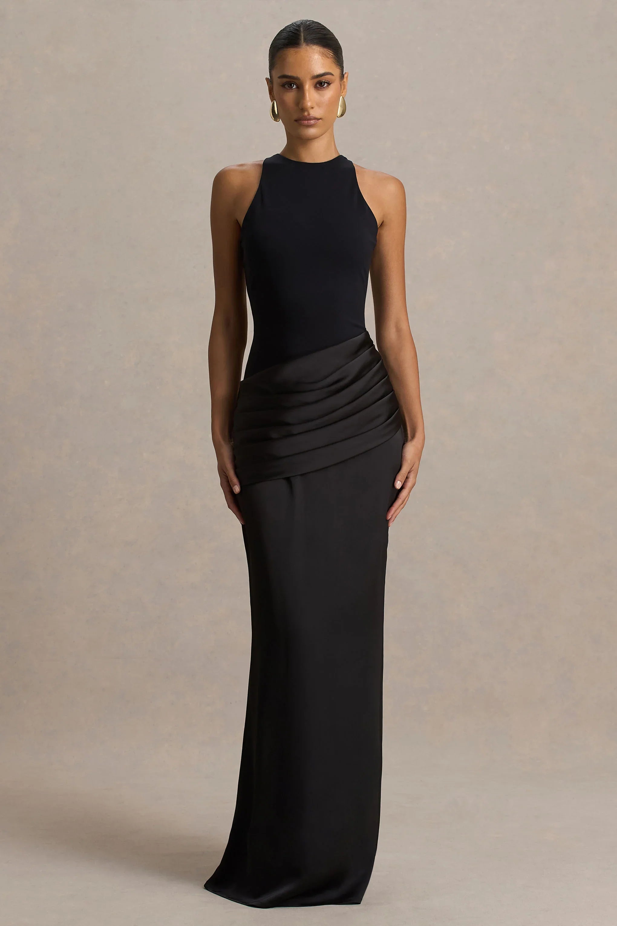 The epitome of sophistication with a sultry twist has landed, Akari. Designed in a combination of our premium jersey and satin in a black hue, this gown is cut to contour and captivate. The elegant high neckline frames the shoulders, while the asymmetric drop waist creates a striking silhouette that flows into a sweeping maxi skirt. Complete with a centre-back split for ease of movement, Akari is made for unforgettable entrances.