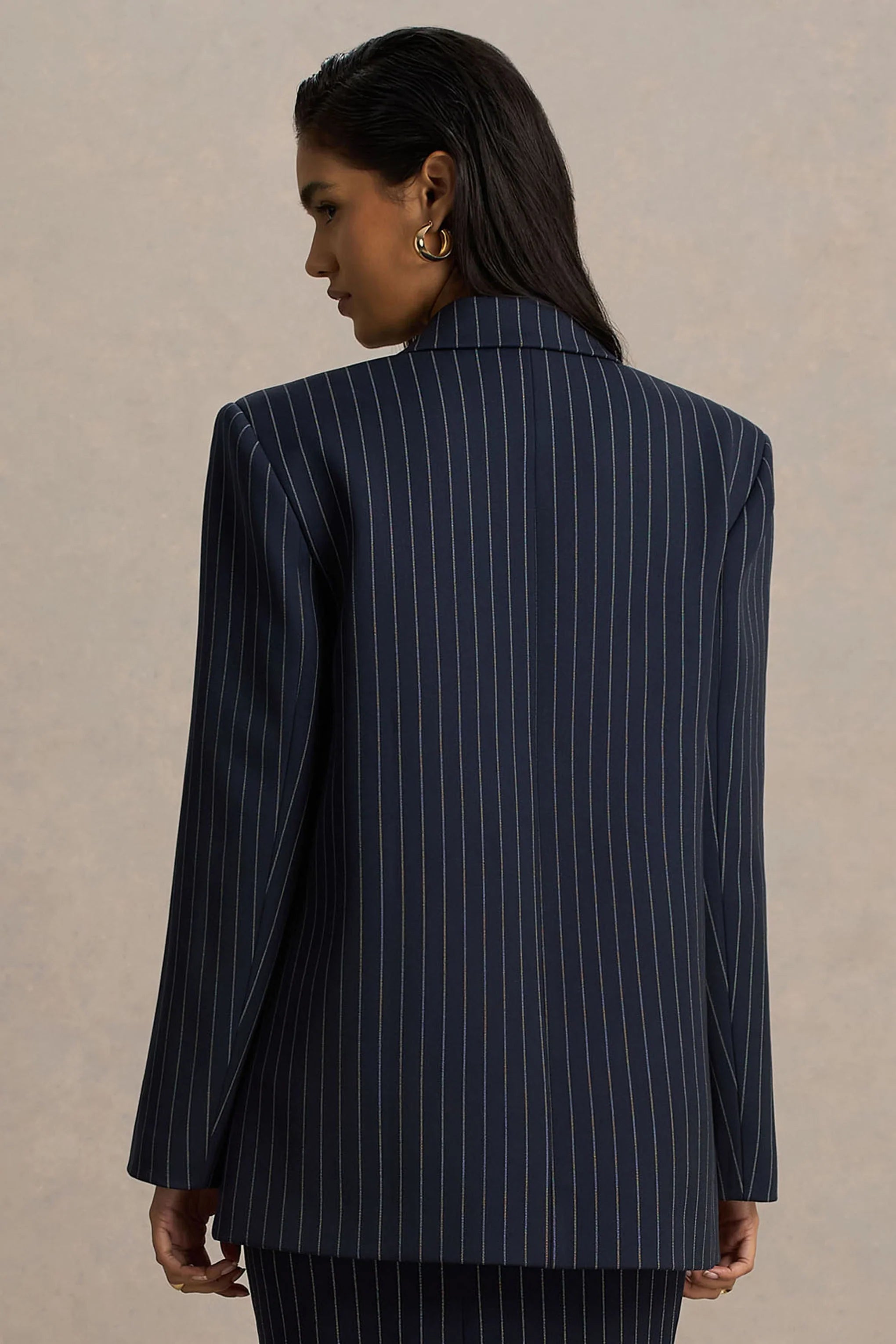 Elevate your tailoring game with Alana, a sleek addition to your wardrobe. Crafted from our premium crepe in a chic navy stripe, this blazer seamlessly enhances any outfit. Featuring a classic collared neckline and a button closure for effortless polish. The boxy fit offers a modern, relaxed silhouette, and it pairs perfectly with our Elana Skirt for a coordinated, head-turning look.