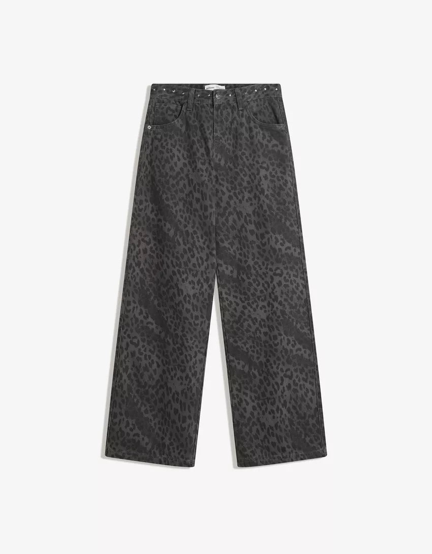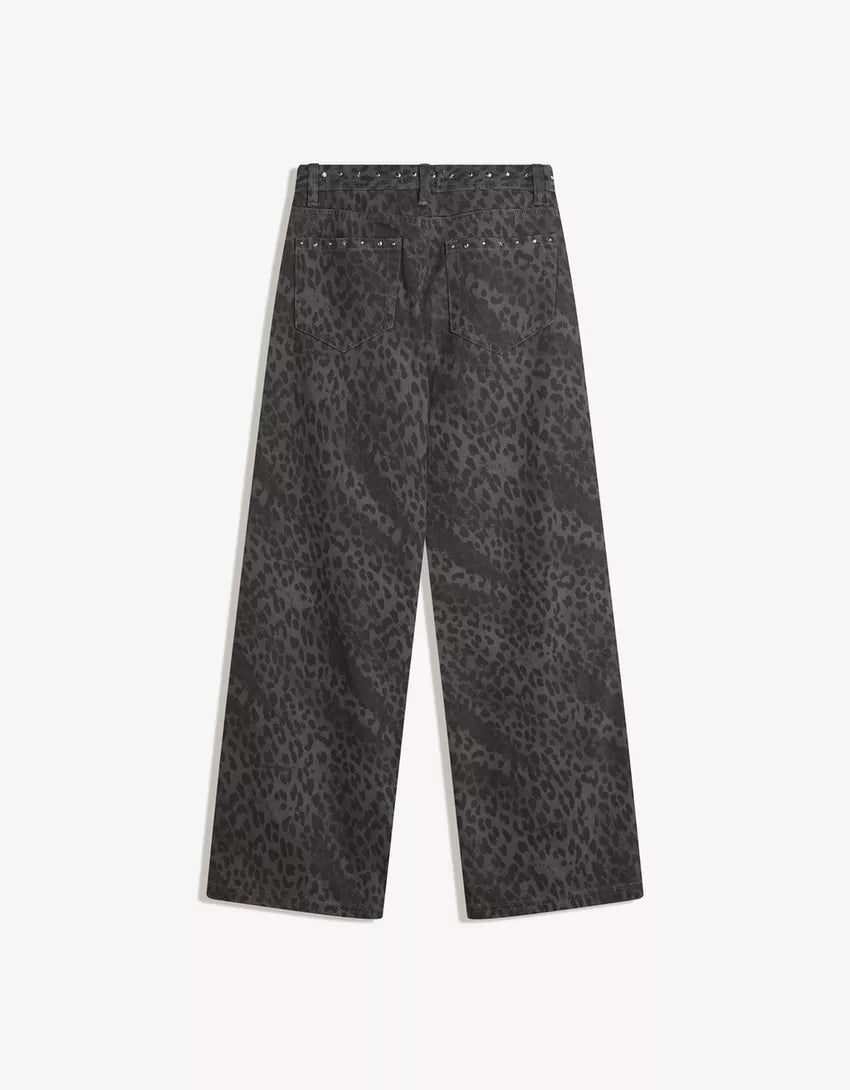 Animal print straight-leg studded pants. Available in dark grey, brown.