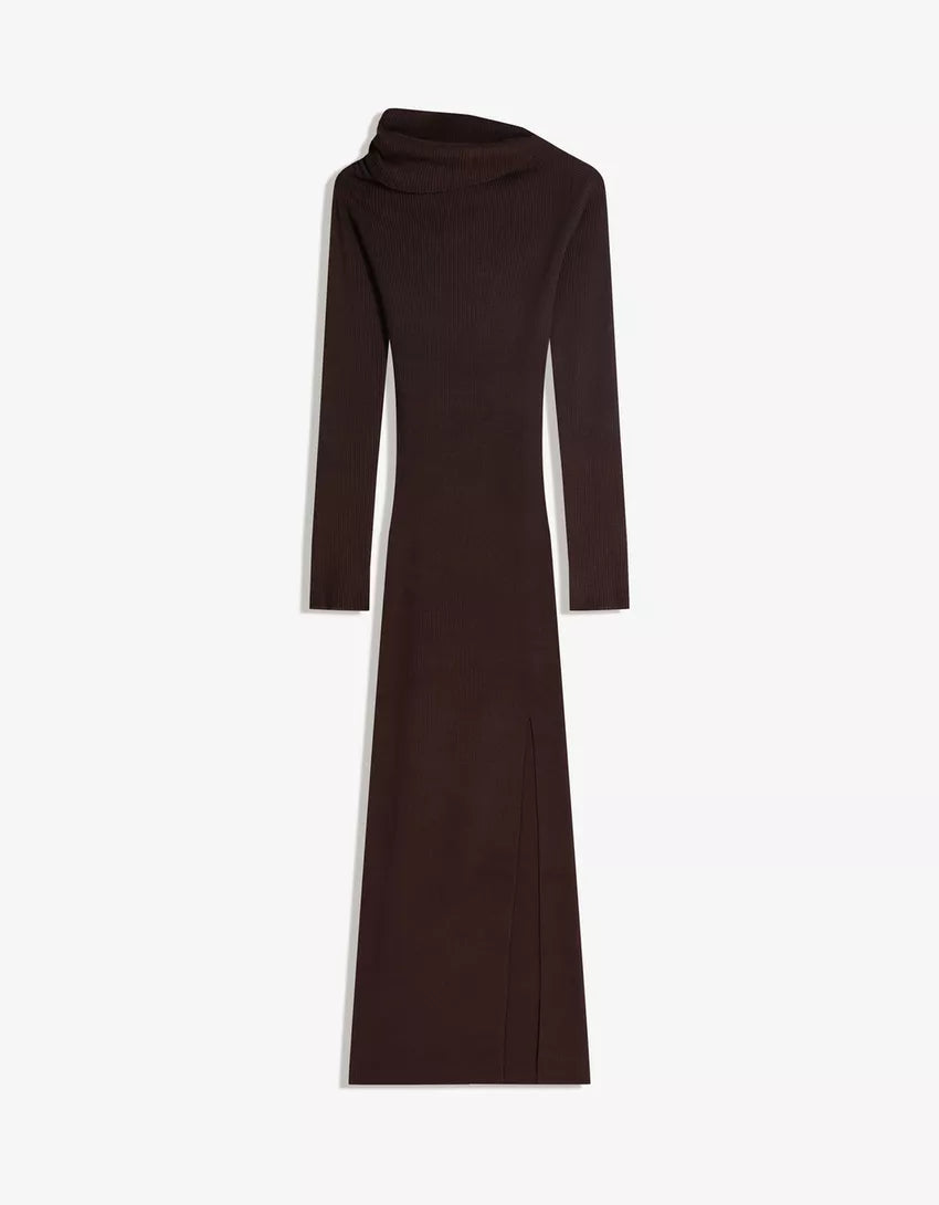Asymmetric midi dress with gathered detail. Available in brown.