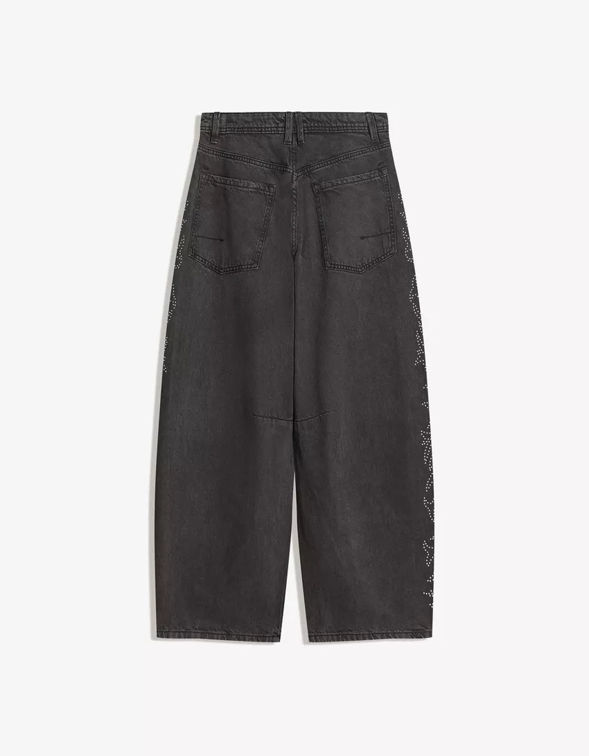 Barrel pants with rhinestone detail. Available in grey.