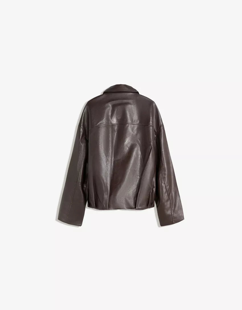 Belted leather effect bomber jacket. Available in brown, khaki.
