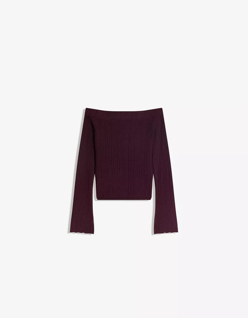 Cable-knit bardot sweater. Available in burgundy, grey.
