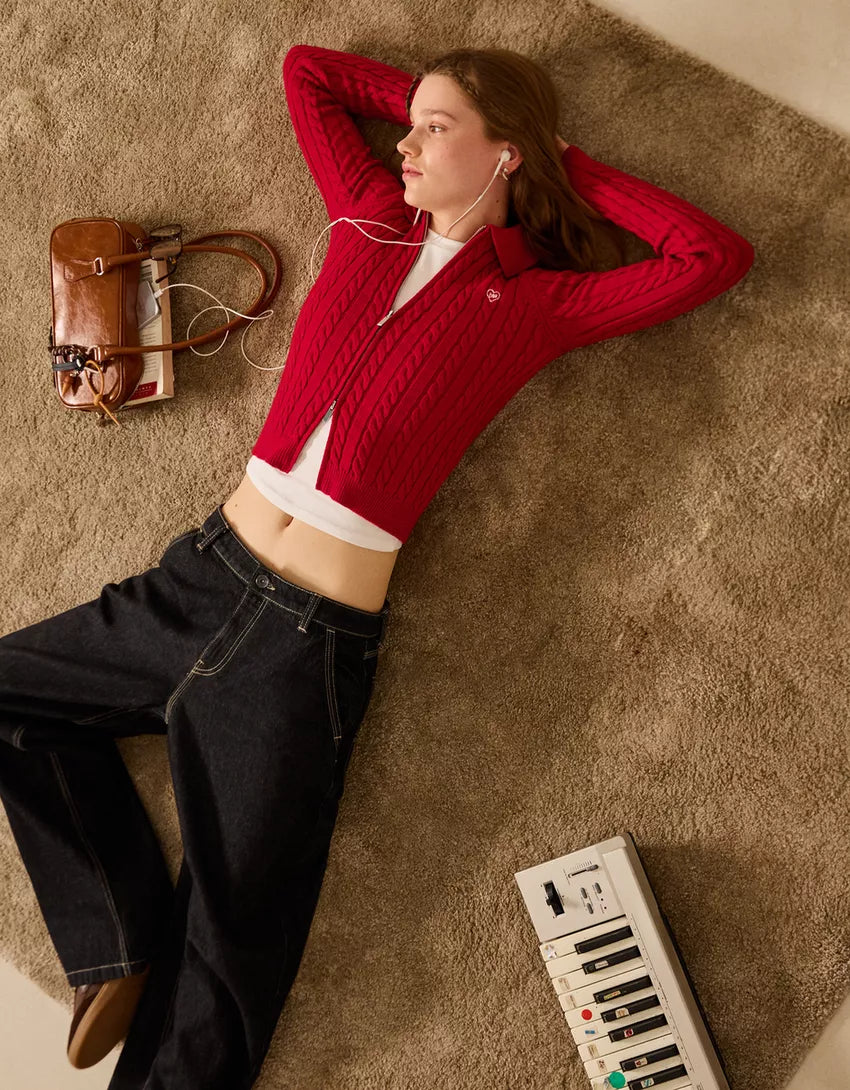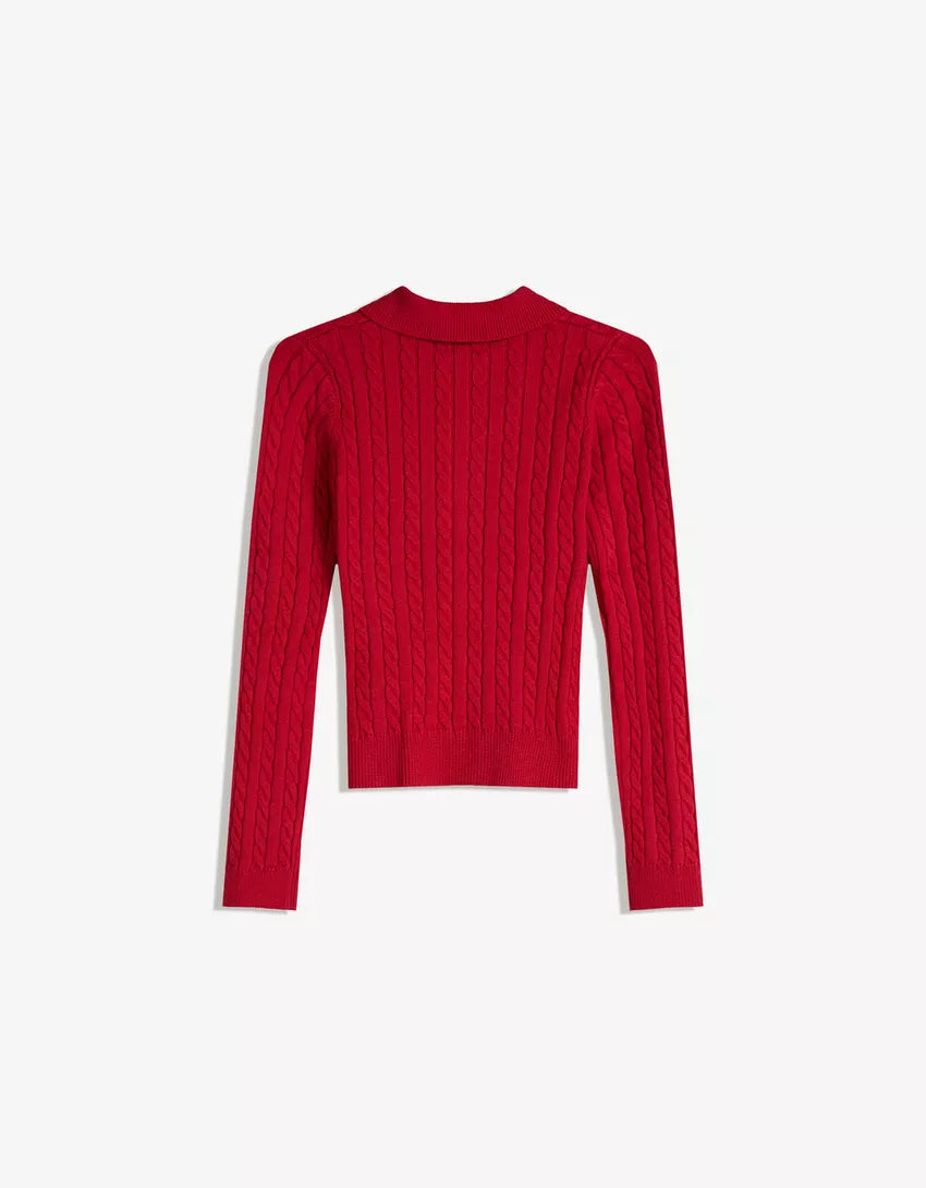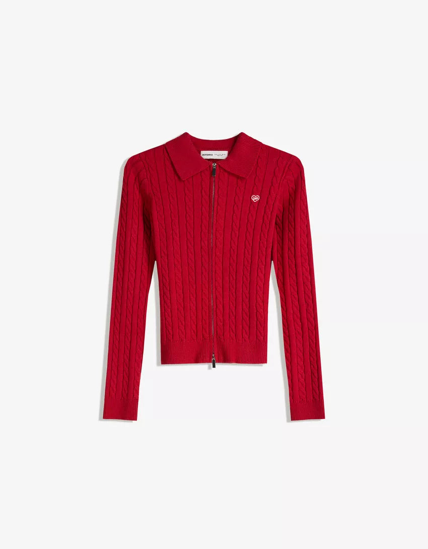 Cable-knit cardigan with a polo collar. Available in red, cream.
