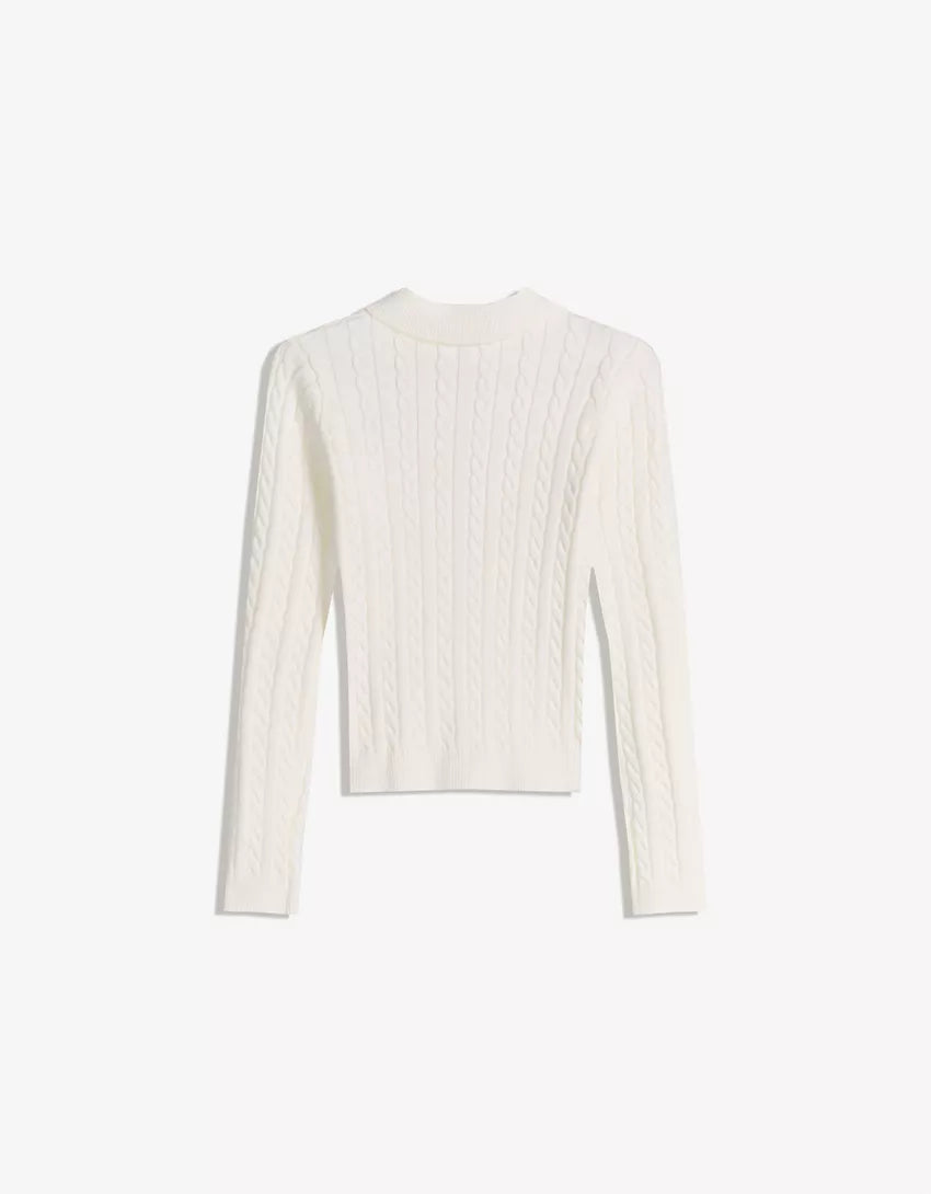 Cable-knit cardigan with a polo collar. Available in cream, red.