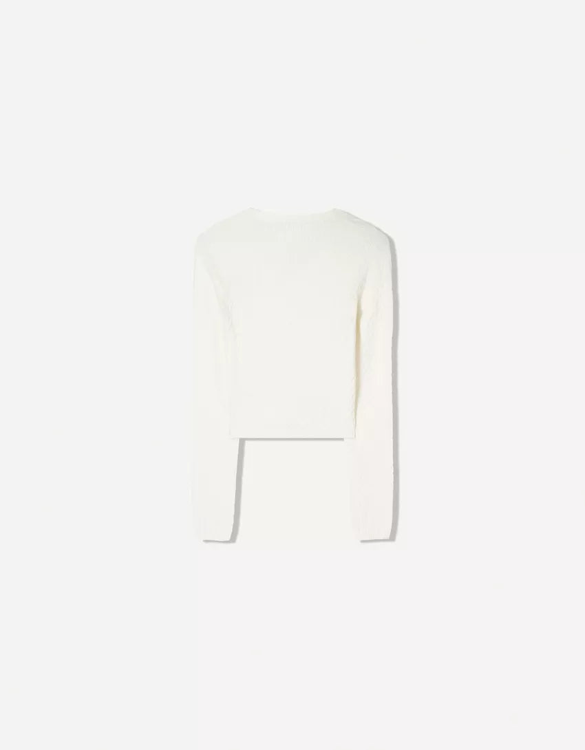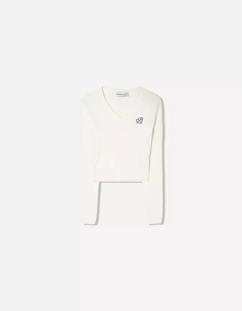 Cable-knit sweater with embroidery. Available in cream, maroon.