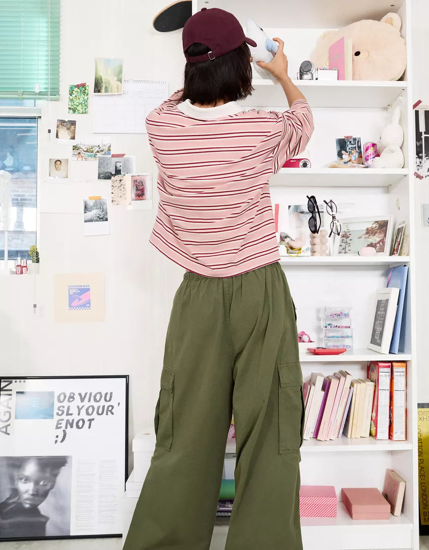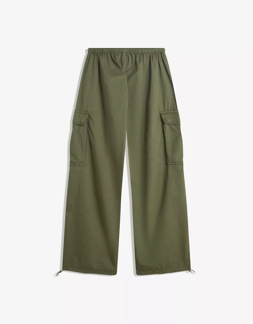 Cargo parachute pants. Available in khaki, burgundy.