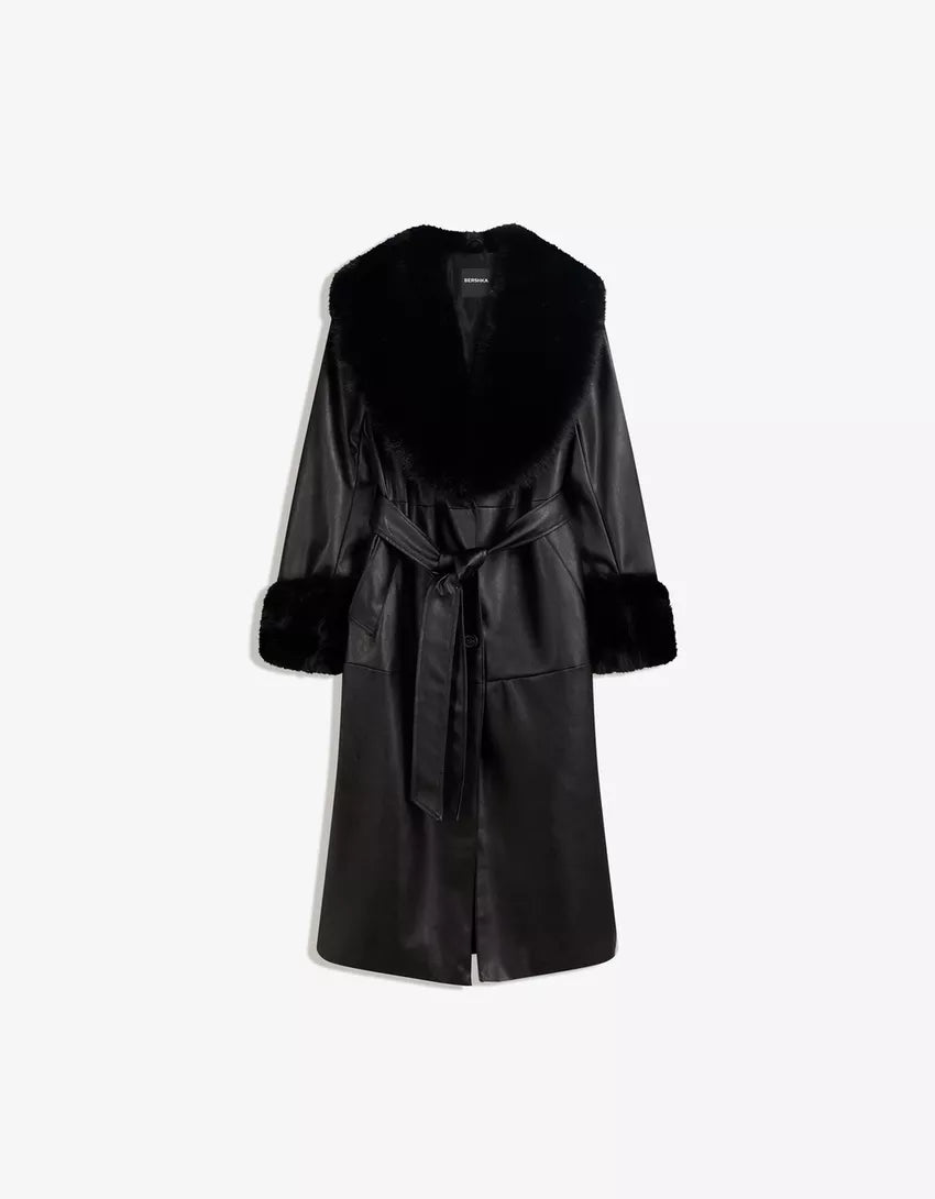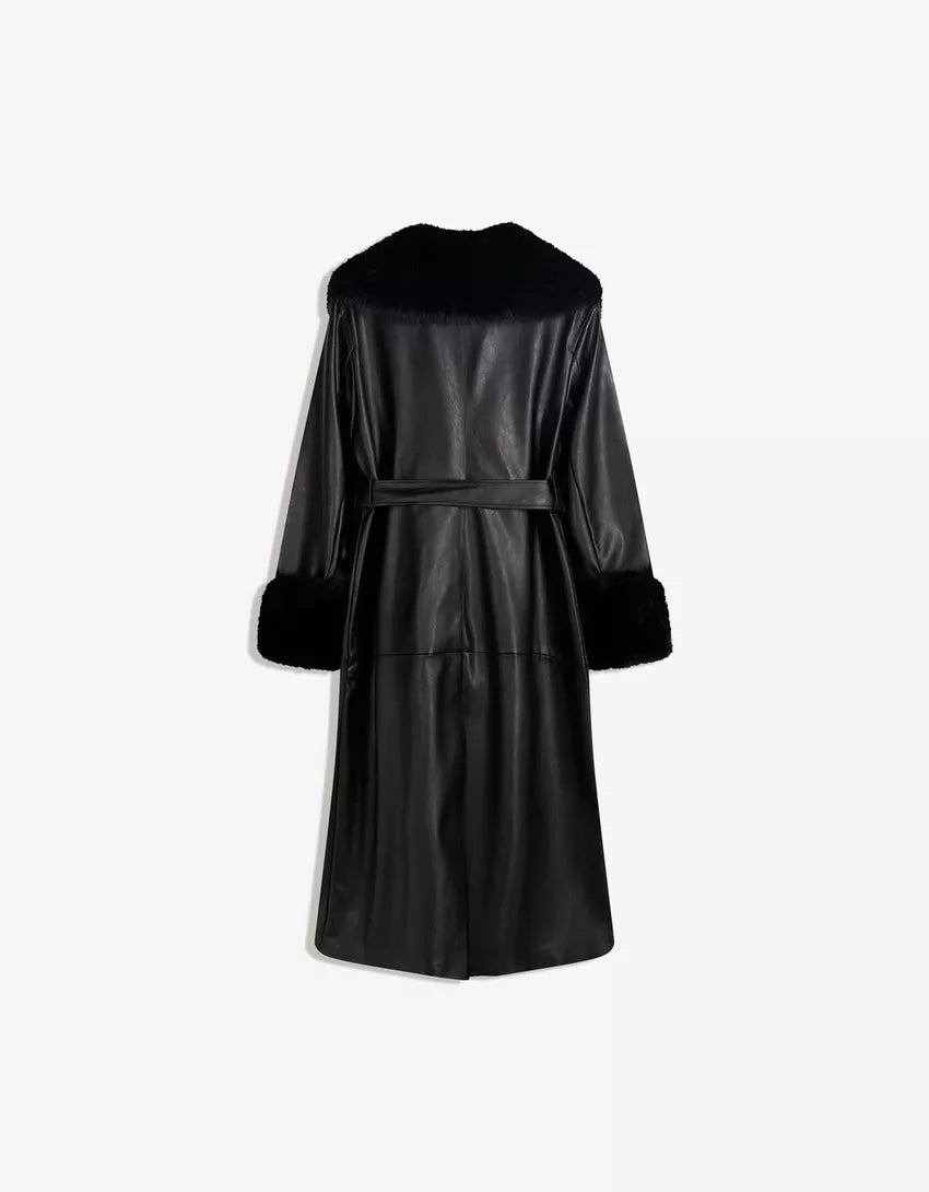Contrast leather effect coat with faux fur. Available in black, brown.