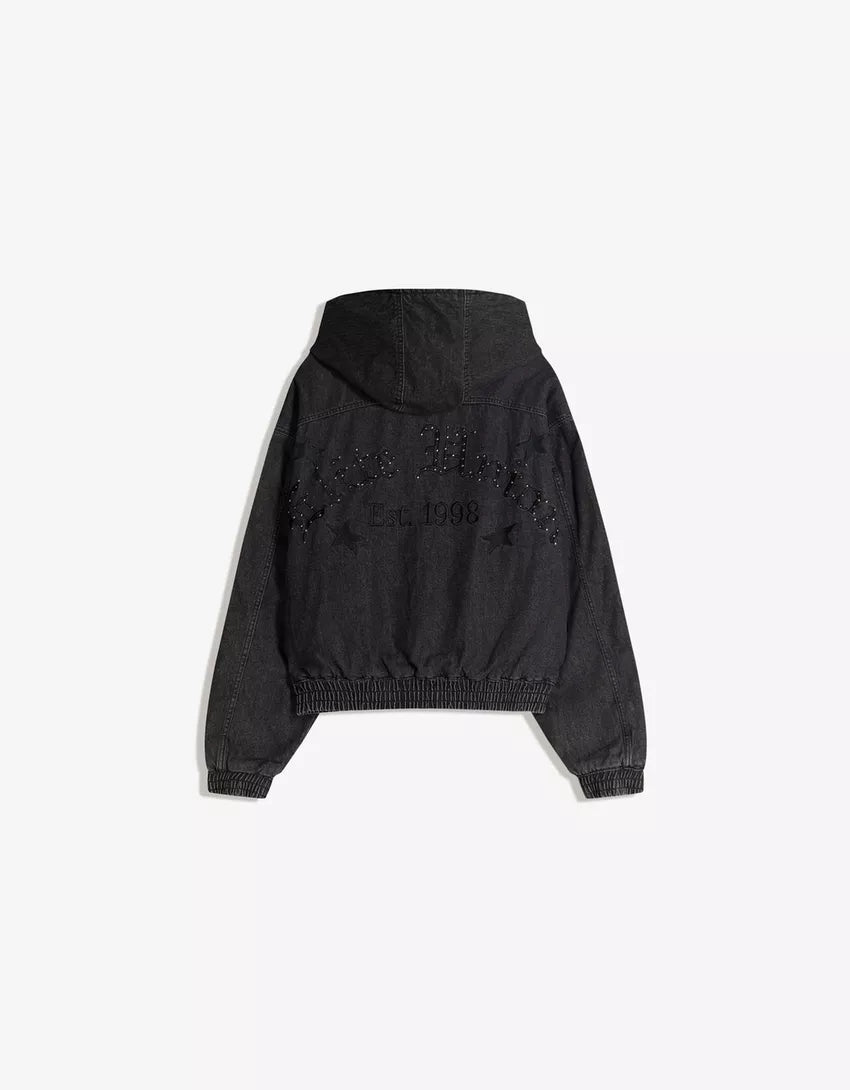 Denim bomber jacket with hood and studs. Available in black.
