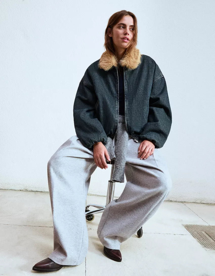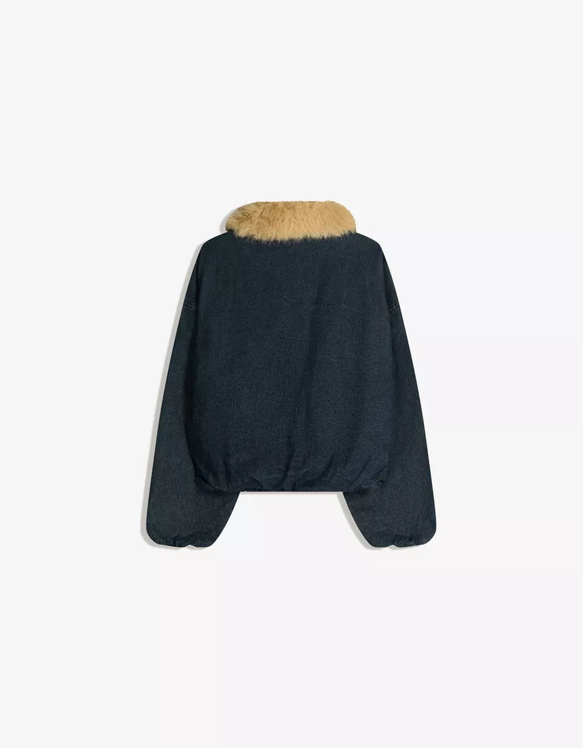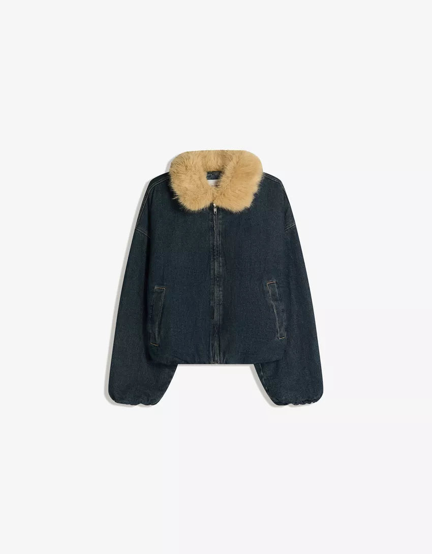 Denim jacket with faux fur collar. Available in light blue, black.