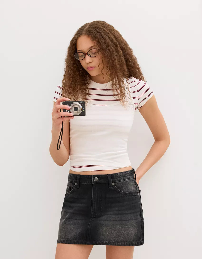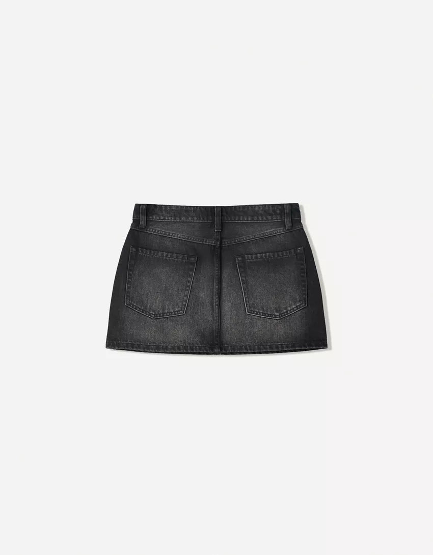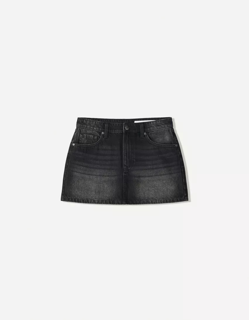 Denim mini skirt. Available in black, blue.