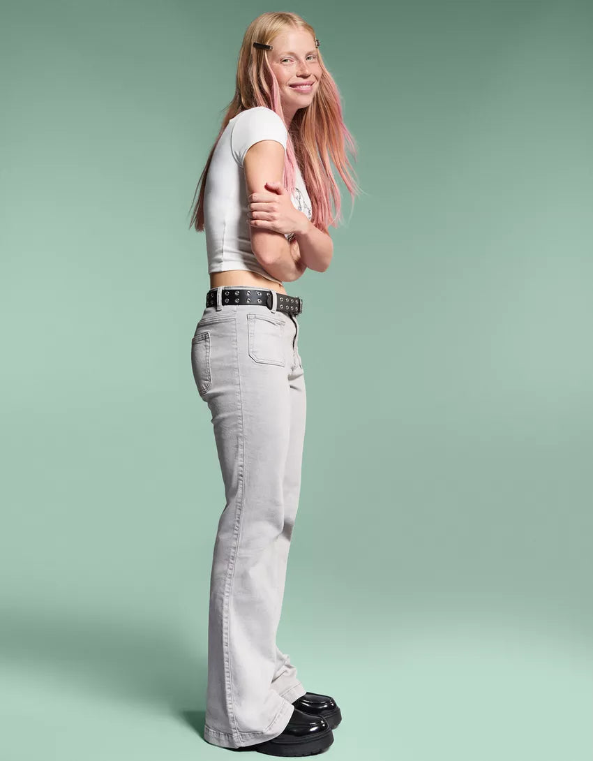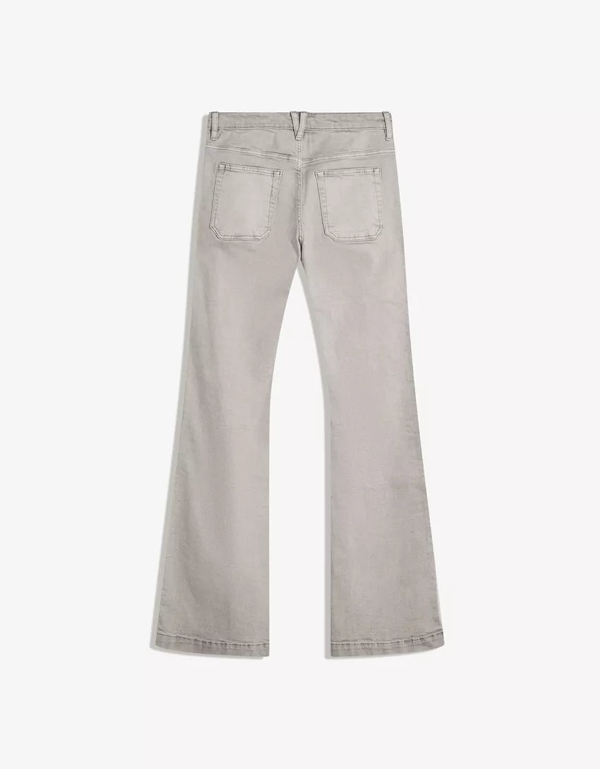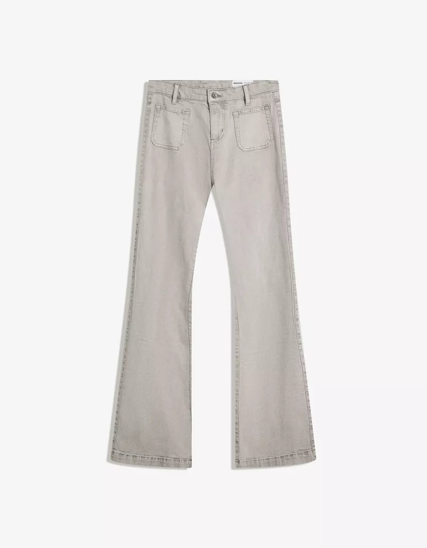 Flared pants with pocket flaps. Available in grey, navy, black.