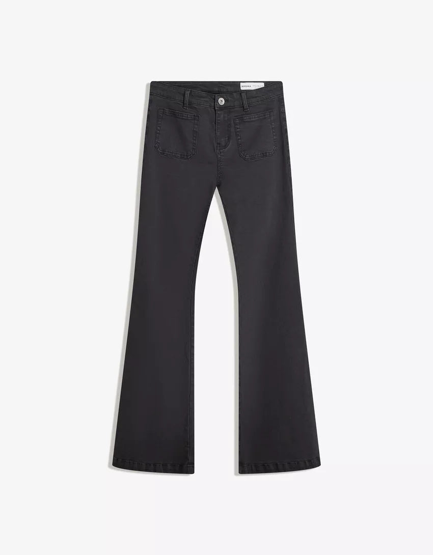 Flared pants with pocket flaps. Available in black, navy, grey.
