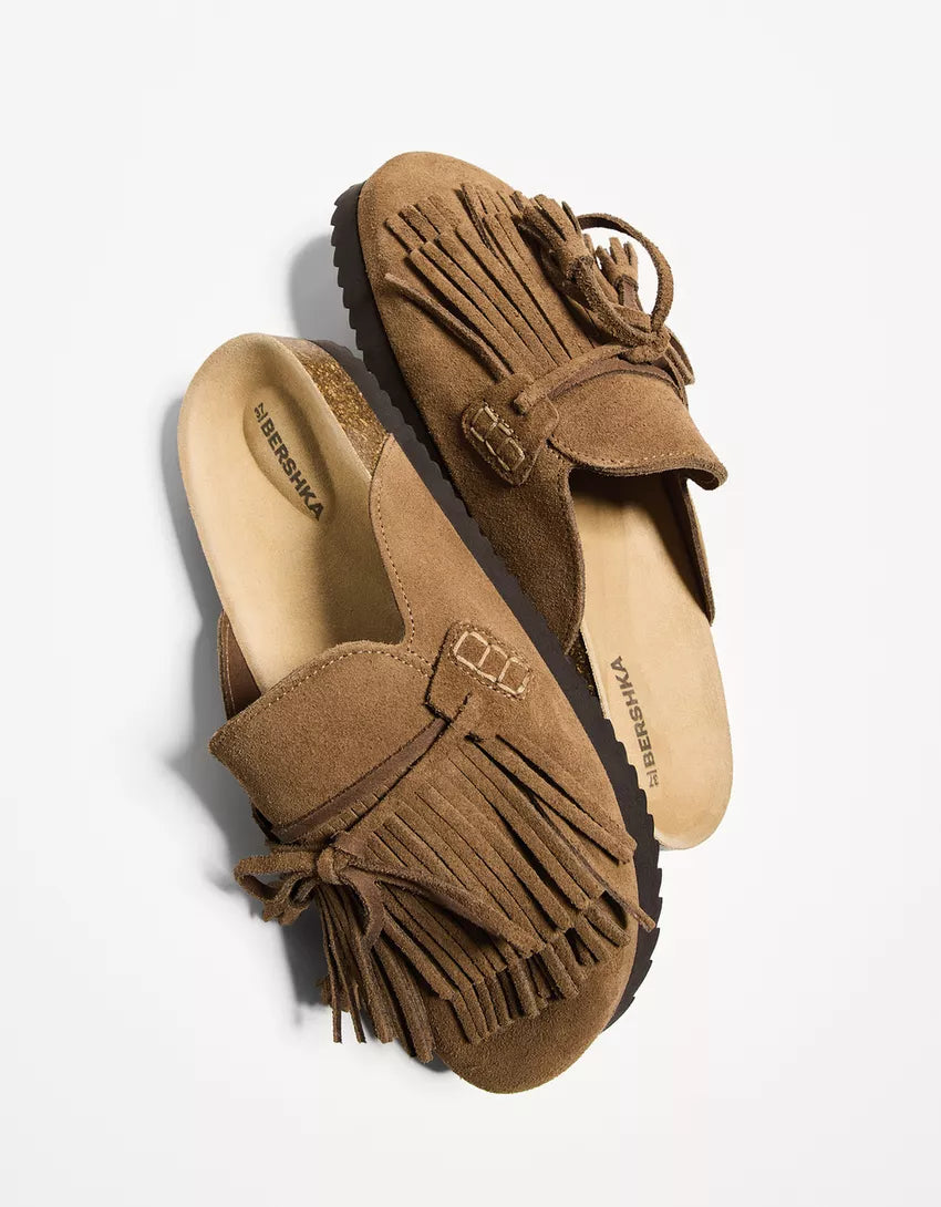 Flat LEATHER clogs with fringe detail. Available in tan.
