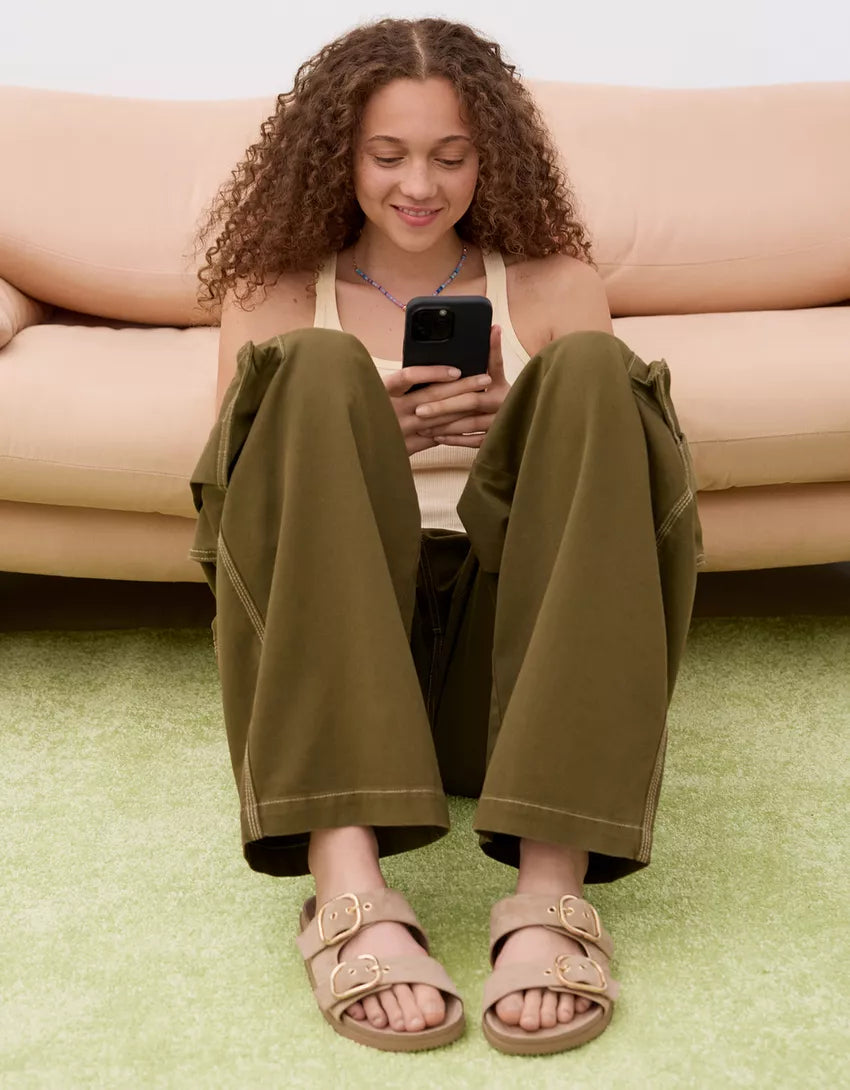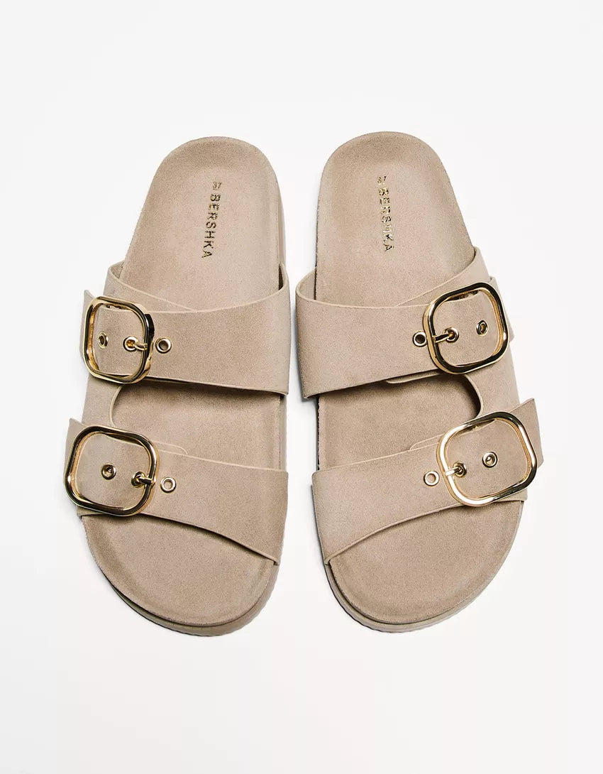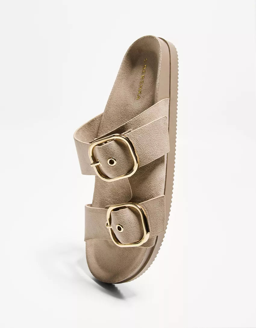 Flat slider sandals with buckles. Available in sand.