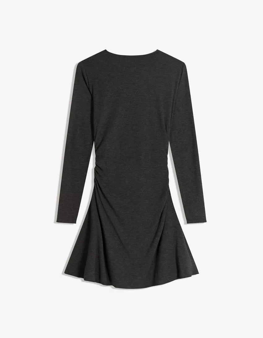 Gathered long sleeve mini dress. Available in dark grey, burgundy.