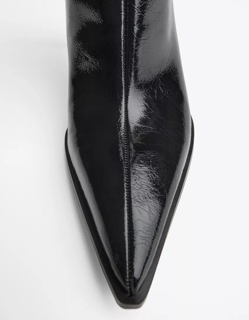 Heeled ankle boot with buckle strap. Available in black.