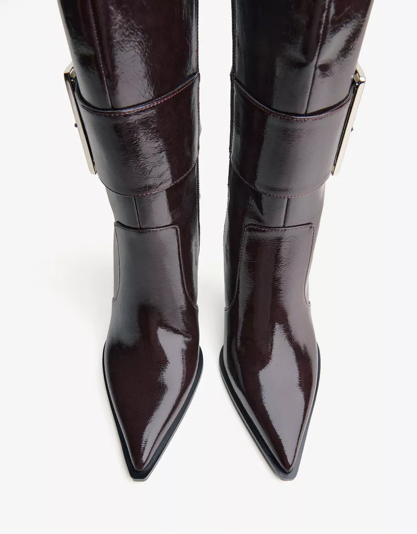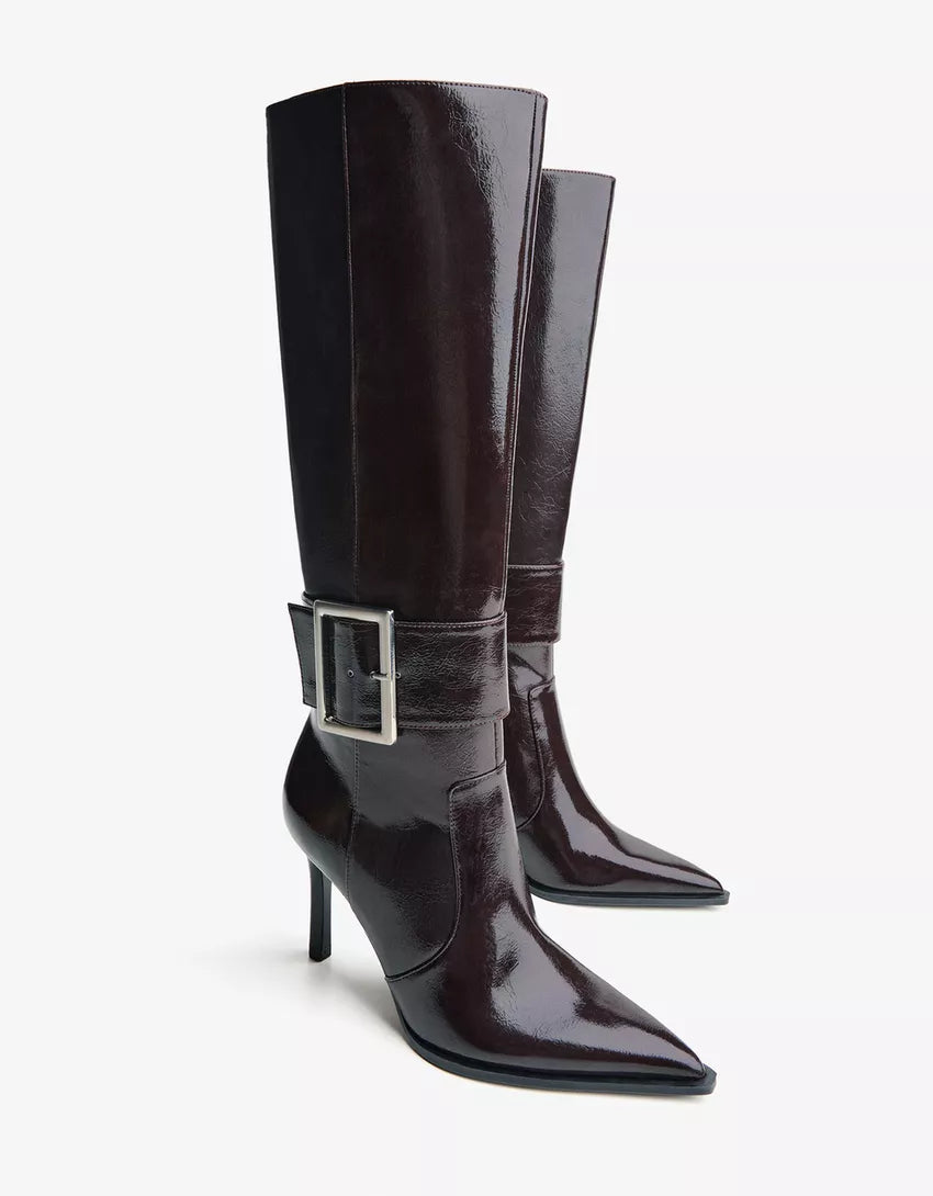 Heeled boots with buckle. Available in brown, black.
