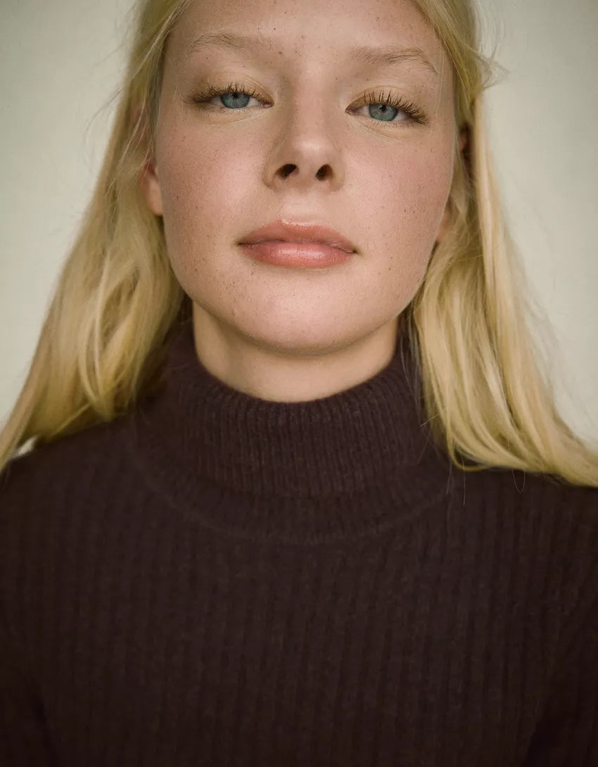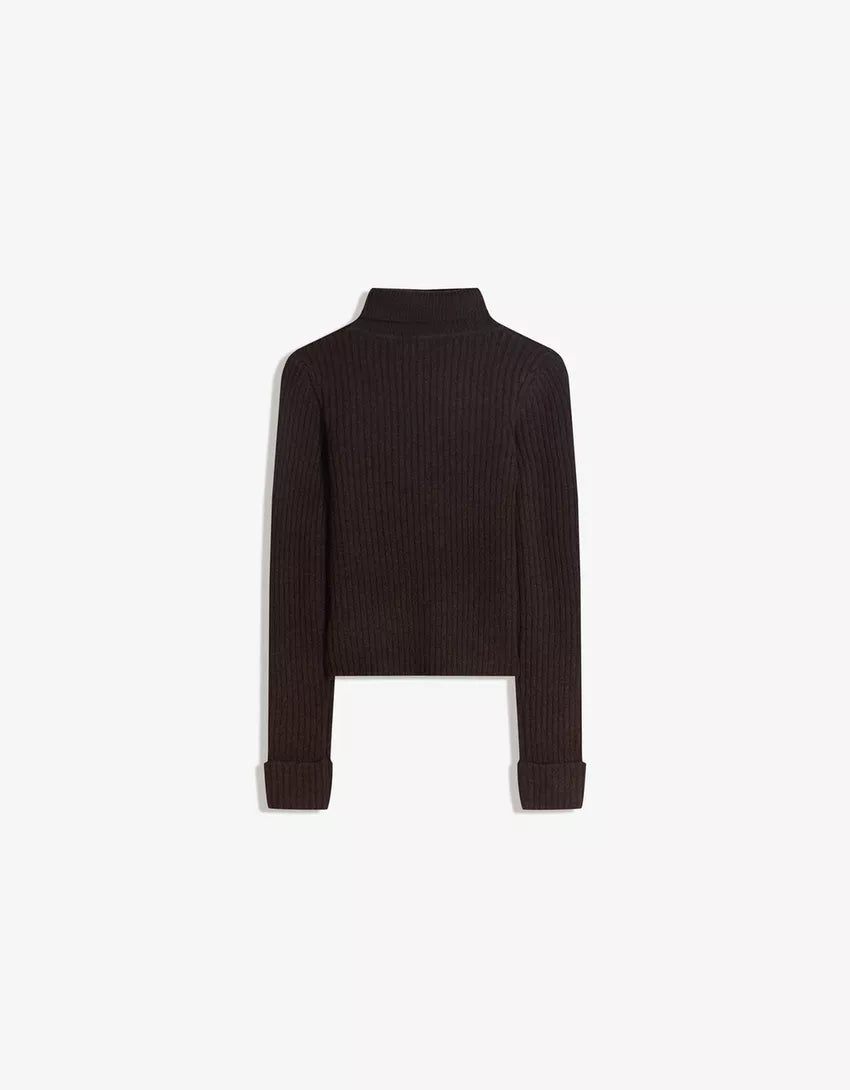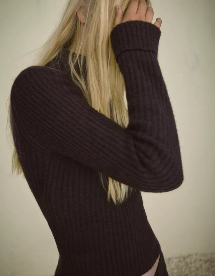 High neck ribbed sweater. Available in brown, blue, cream, dark grey.