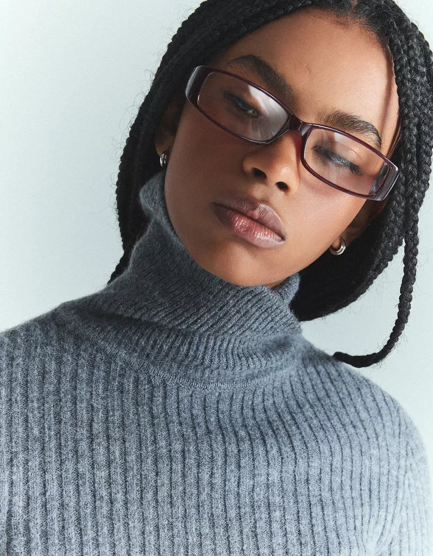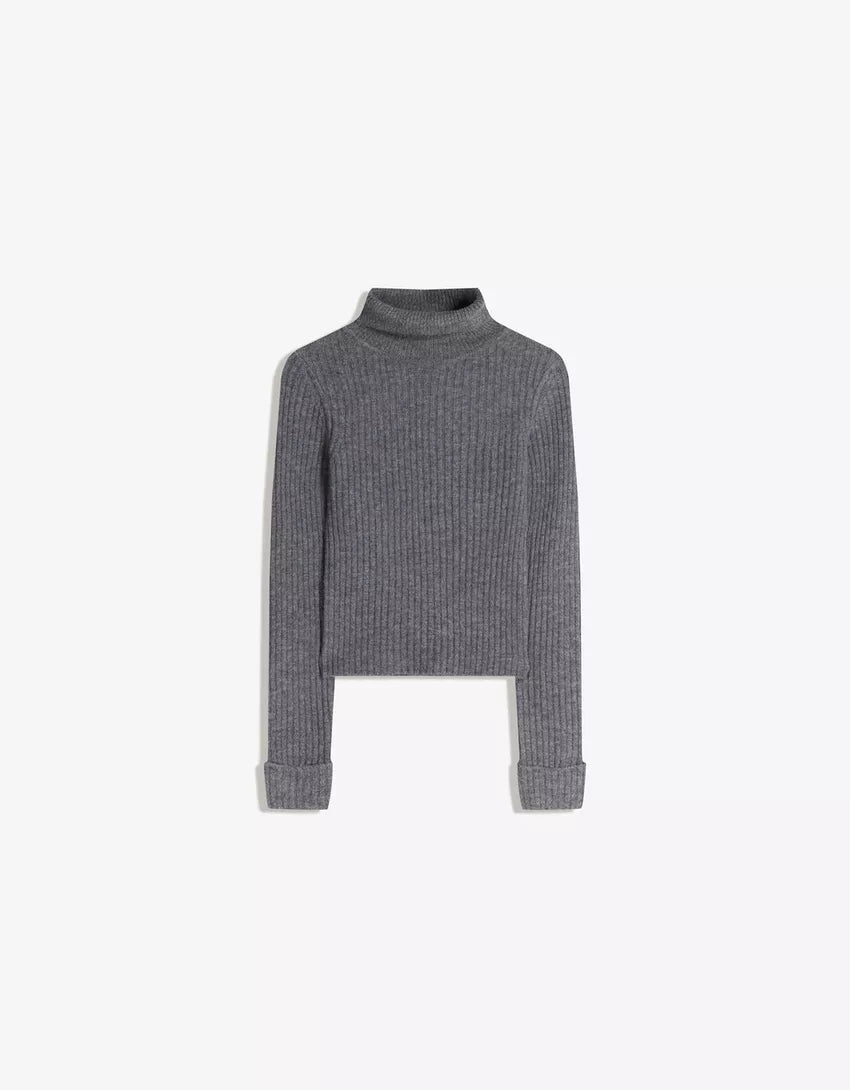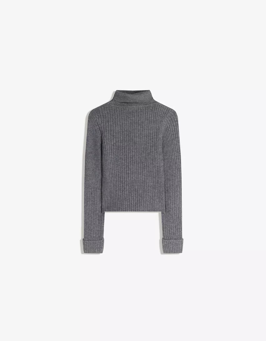 High neck ribbed sweater. Available in dark grey, blue, brown, cream.