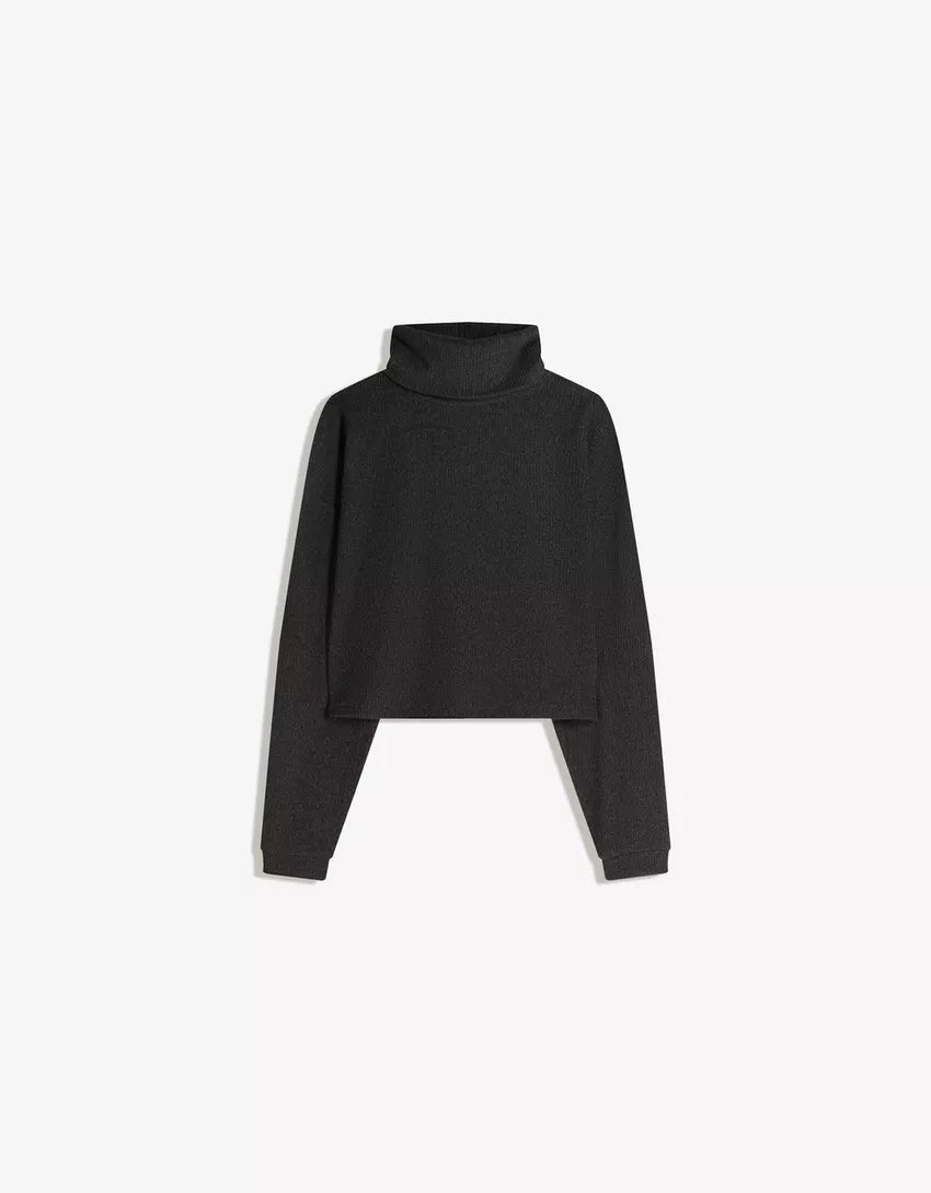 High neck ribbed sweater. Available in dark grey, sand, yellow, cream.