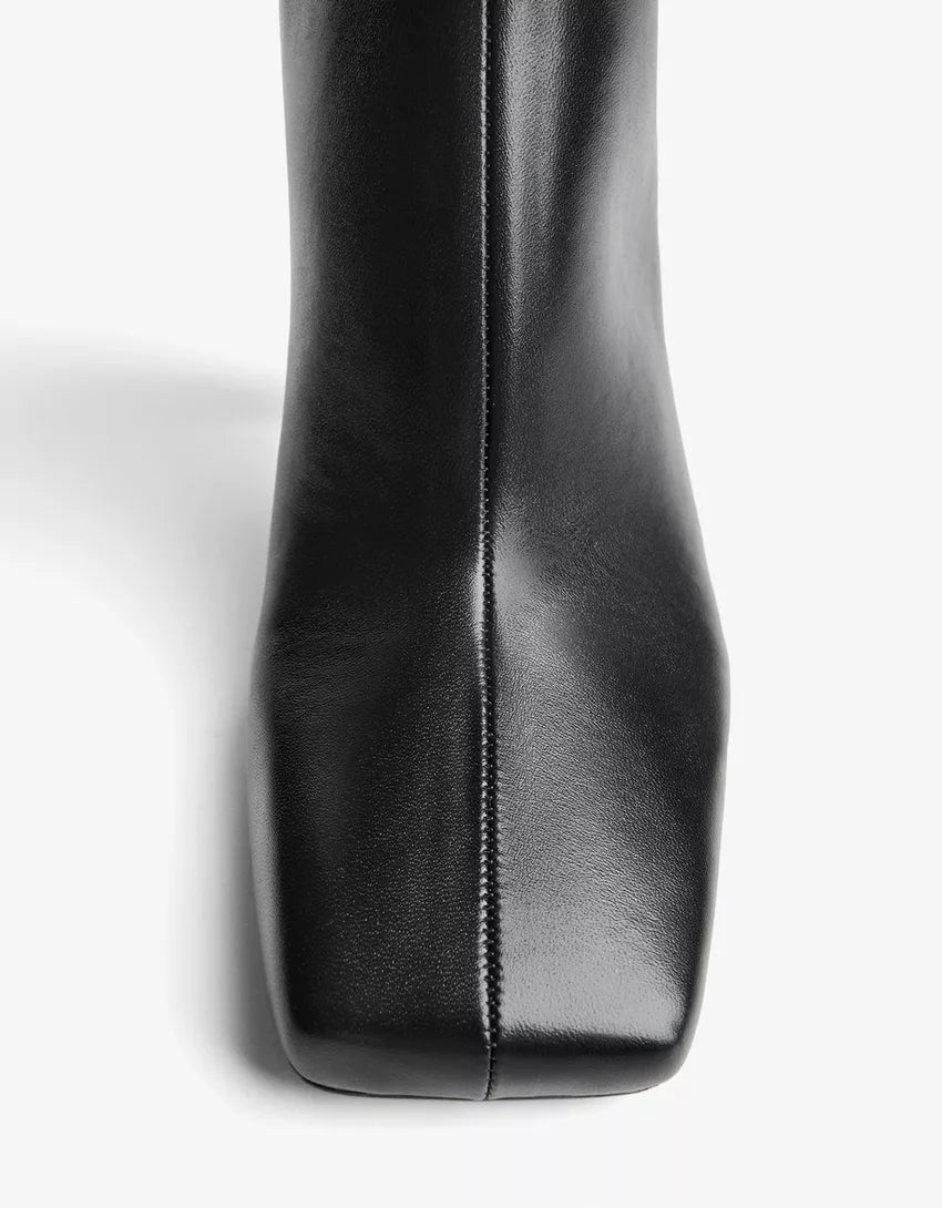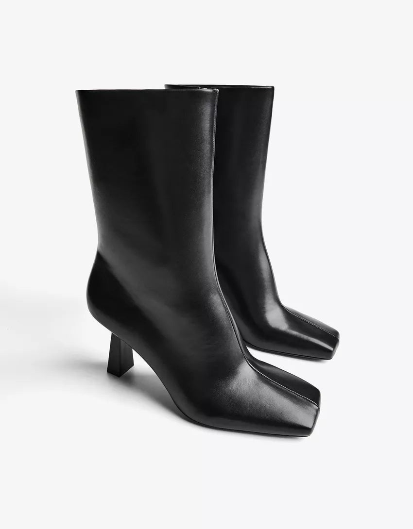 Kitten-heel ankle boots with square toe. Available in black.