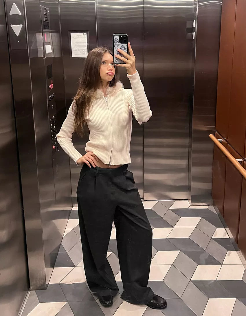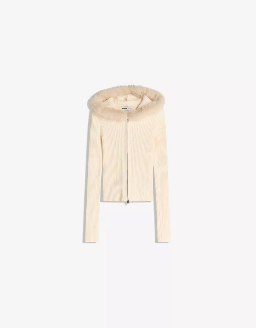 Knitted Zip-Up Jacket with Faux Fur Hood. Available in cream, brown.