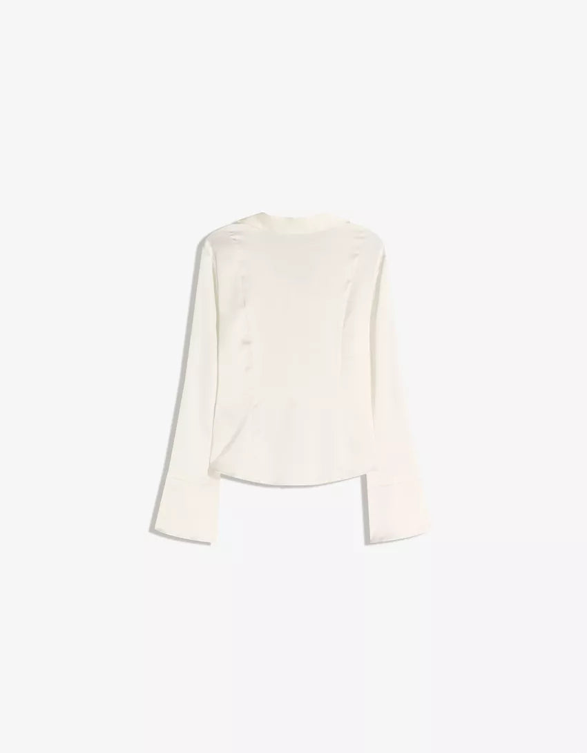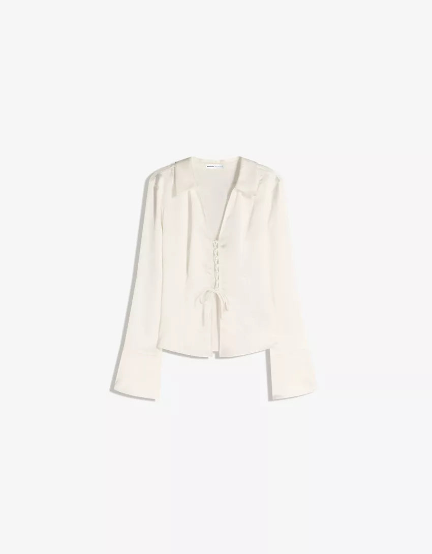 Lace-up satin shirt. Available in cream, brown.