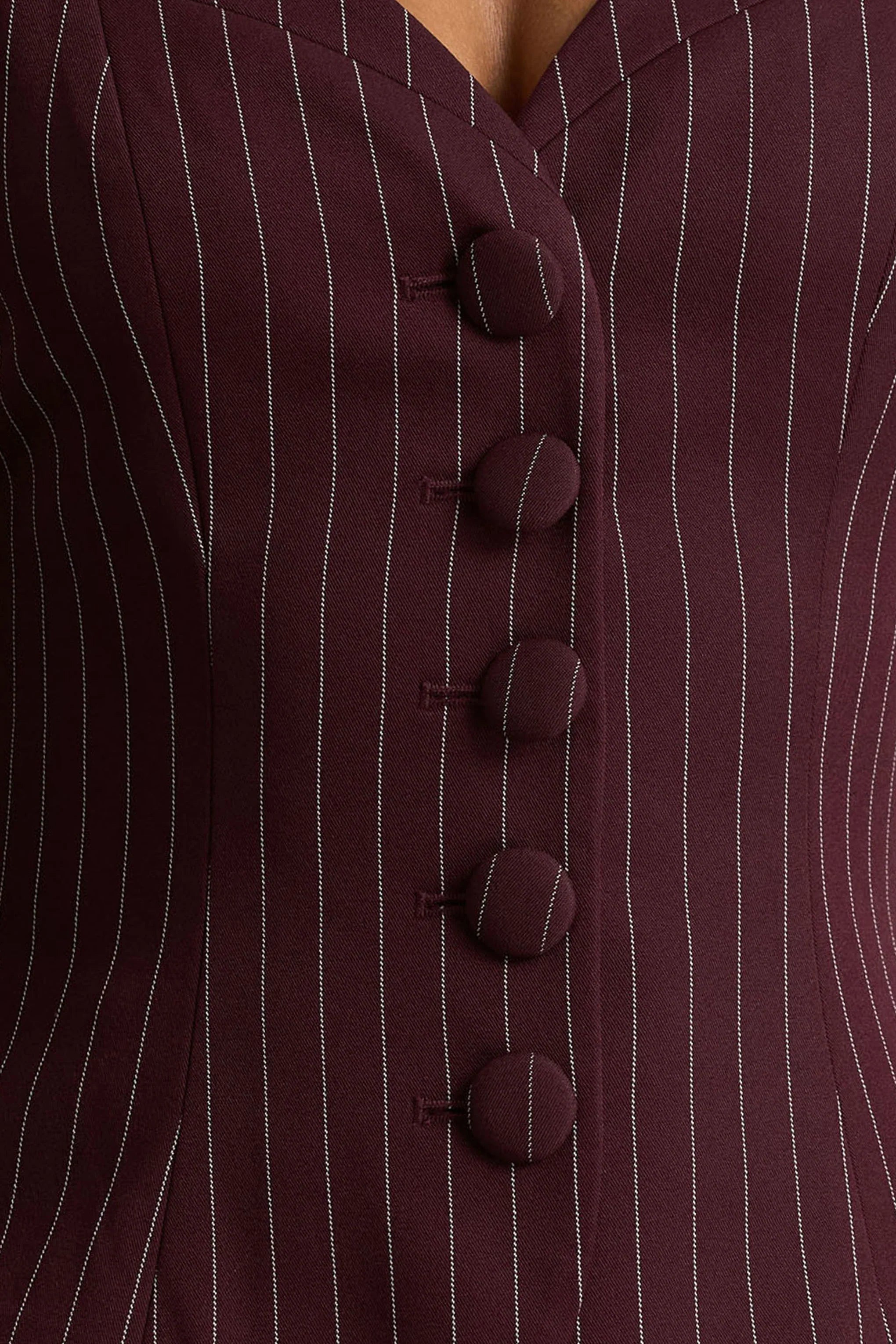 Tailored to perfection, Lana is a sleek and feminine take on power dressing. Crafted from our premium burgundy pinstripe woven fabric, this top effortlessly elevates any outfit. Featuring a flattering sweetheart neckline framed by long sleeves for a sophisticated finish. Functional self-covered buttons run through the front, enhancing the refined, tailored silhouette. Pair with our Asteria trousers for a commanding co-ord look that blends elegance with edge.