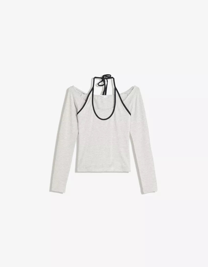 Long sleeve halter neck T-shirt. Available in grey, black.