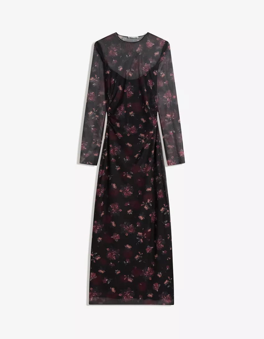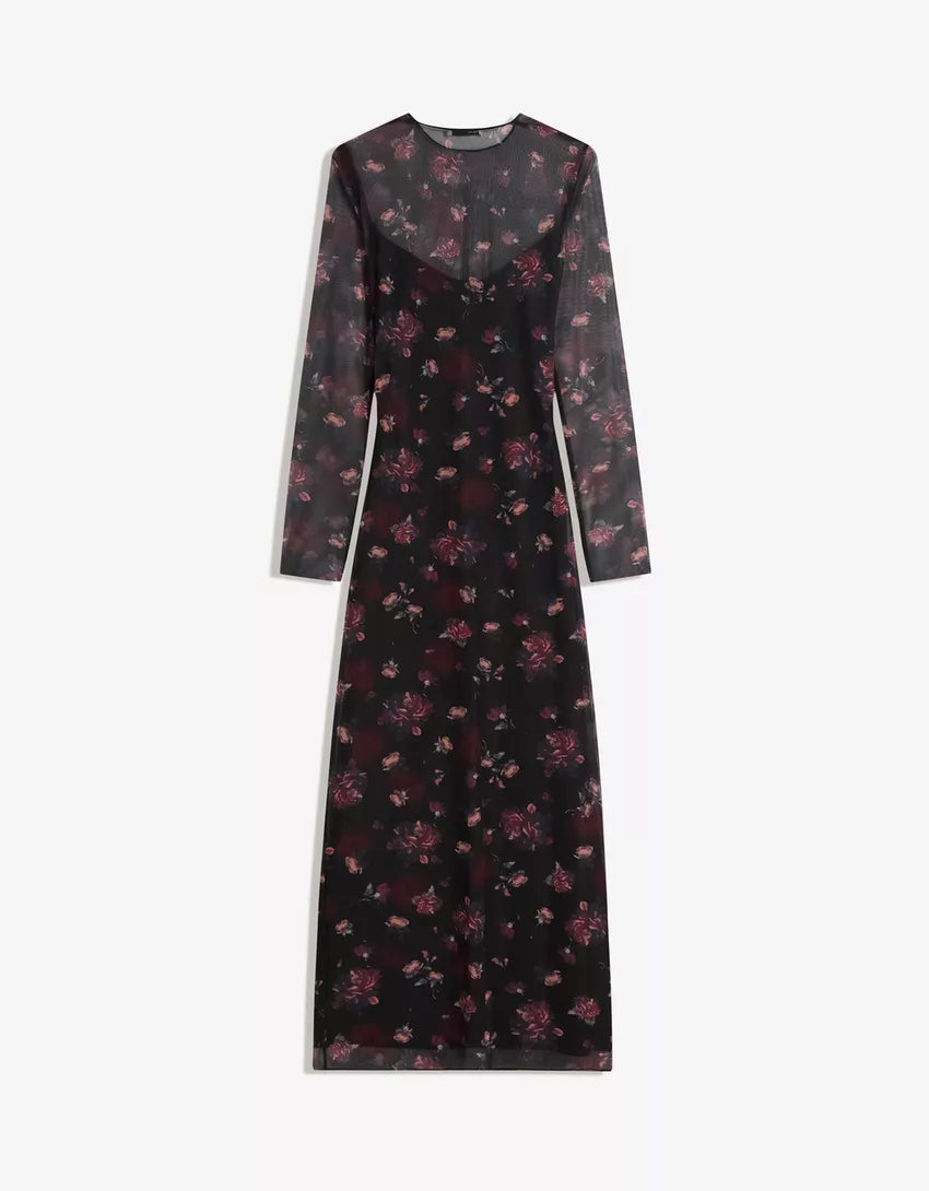 Long sleeve tulle midi dress. Available in burgundy, black.