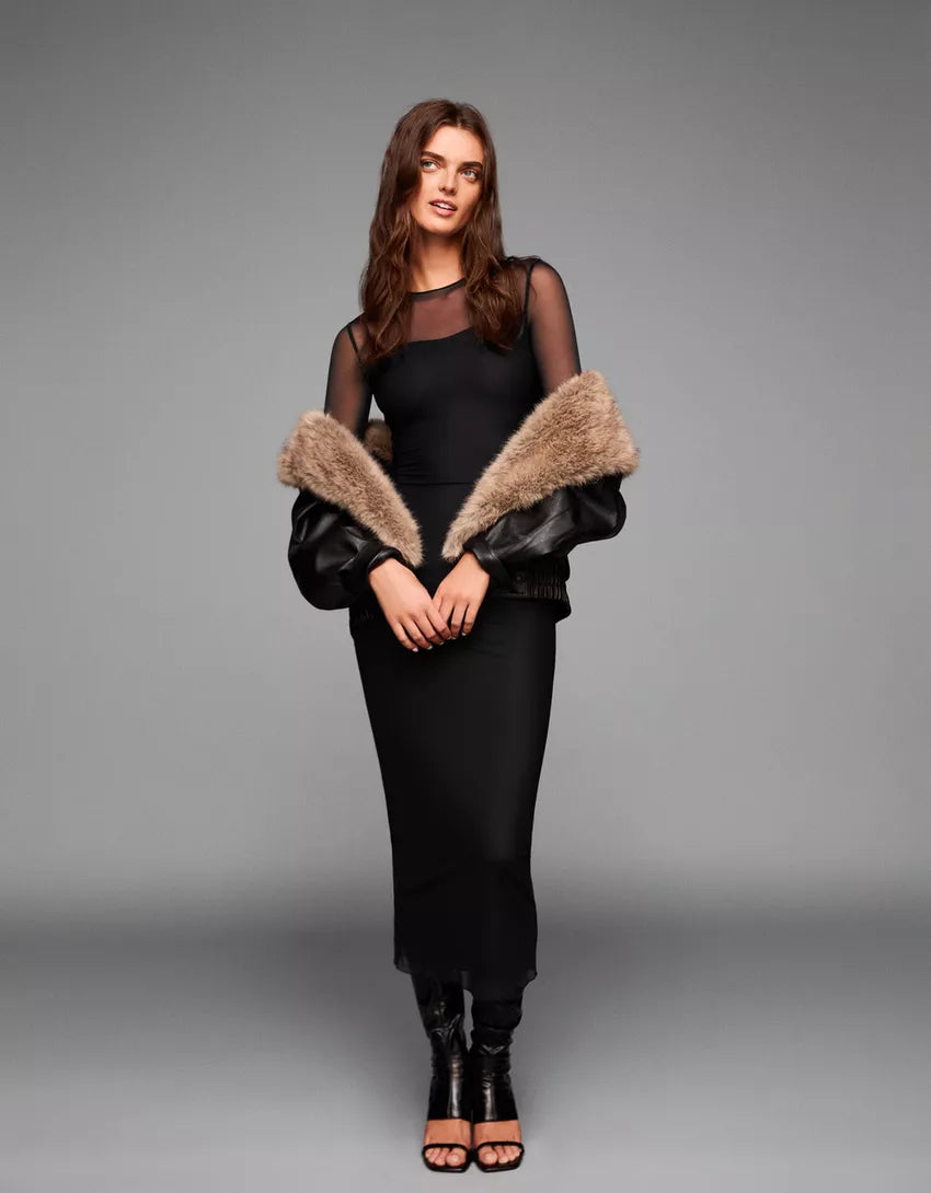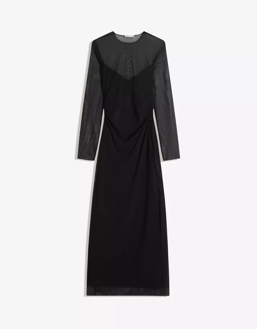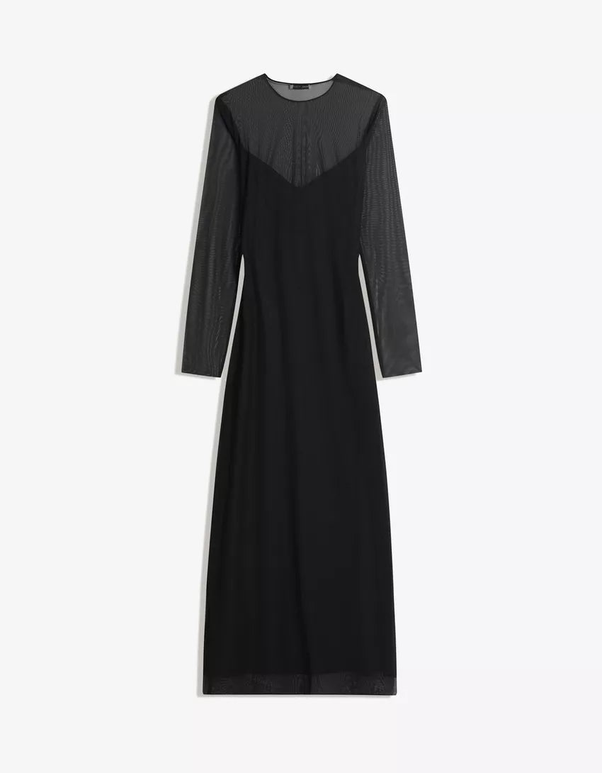 Long sleeve tulle midi dress. Available in black, burgundy.