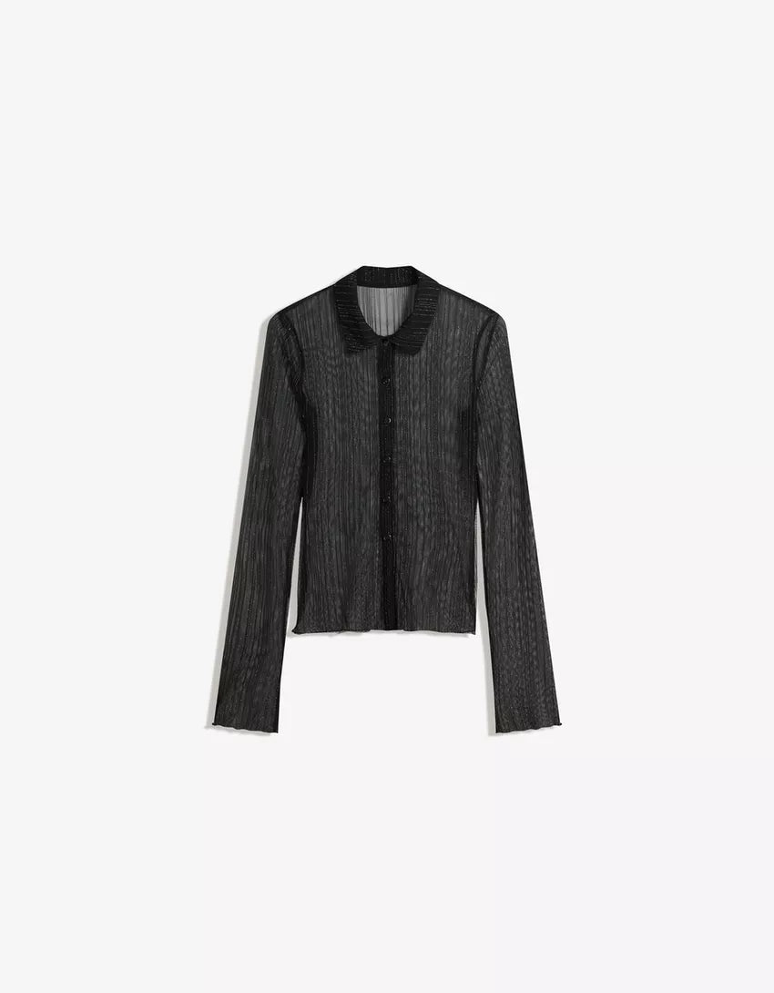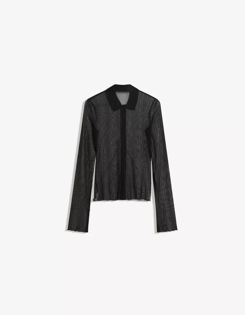 Long sleeve tulle T-shirt with rhinestones. Available in black, navy.