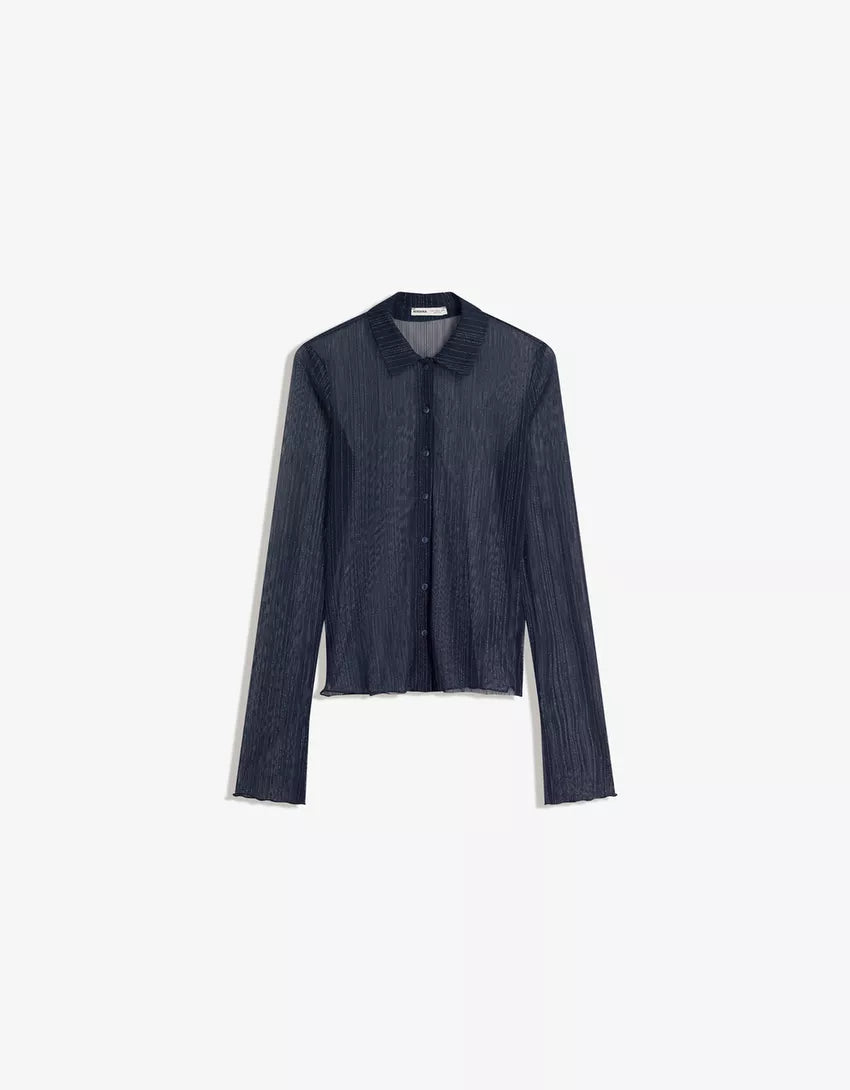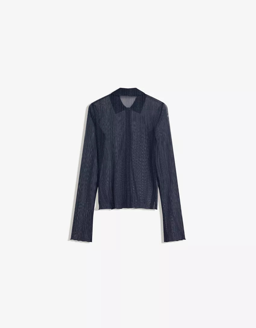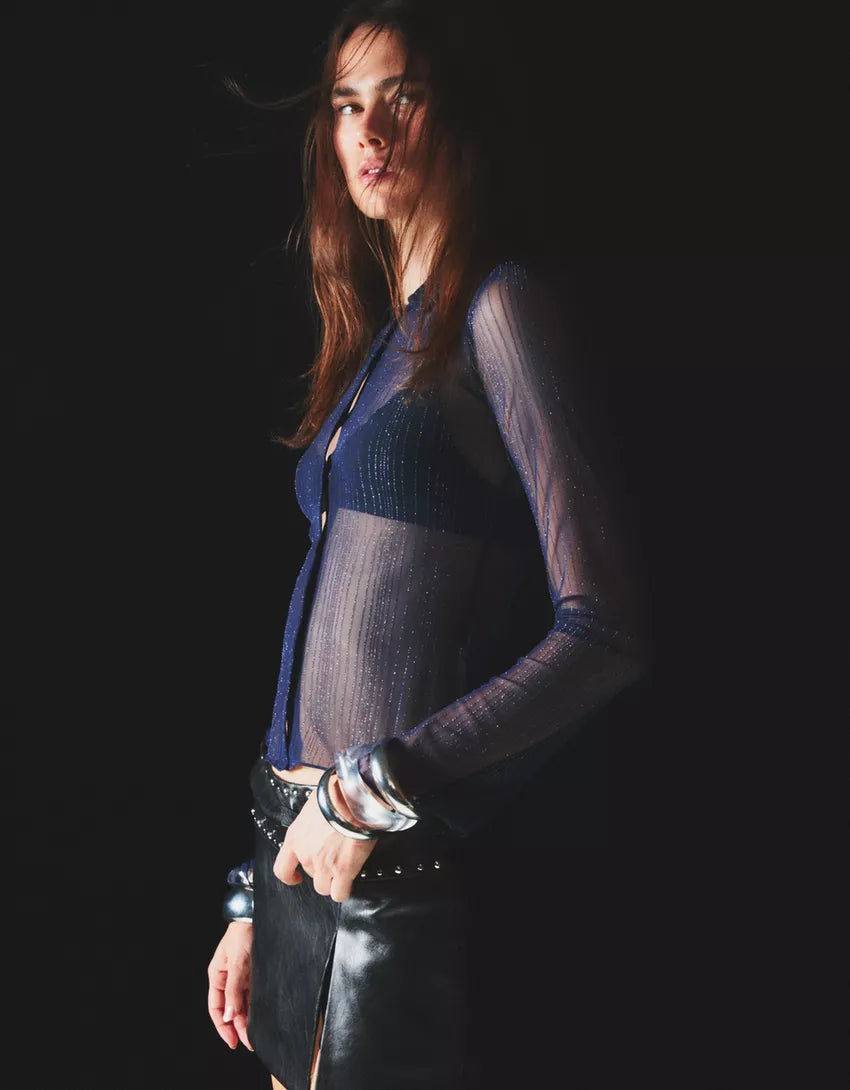 Long sleeve tulle T-shirt with rhinestones. Available in navy, black.