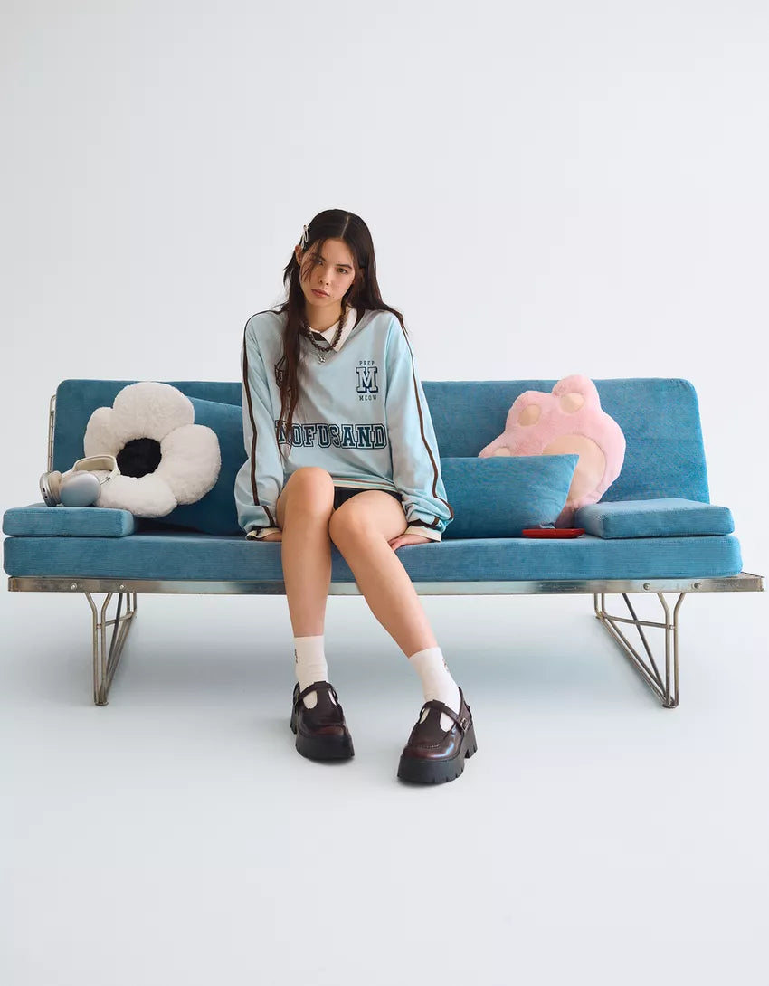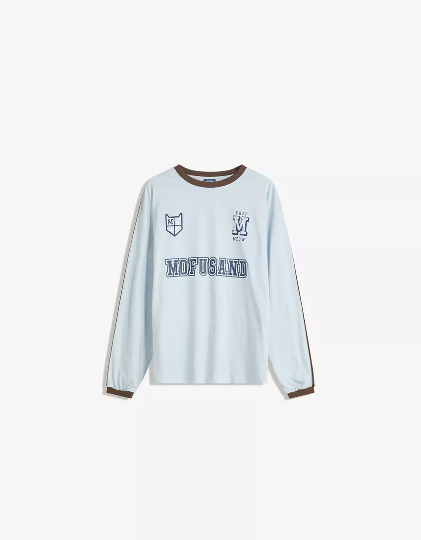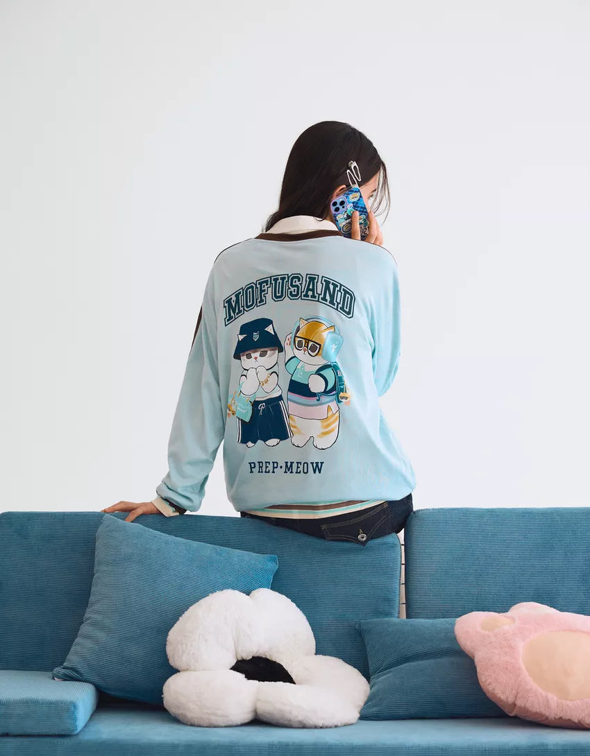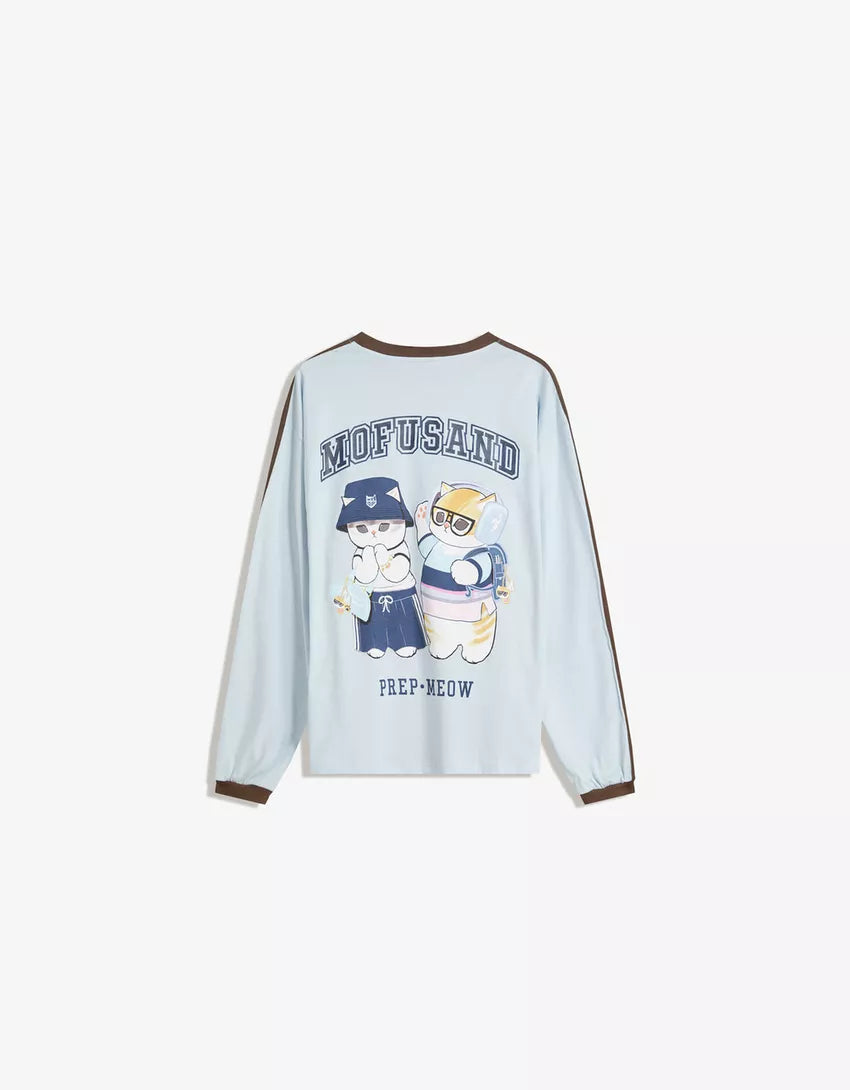 Mofusand print long sleeve T-shirt. Available in light blue.