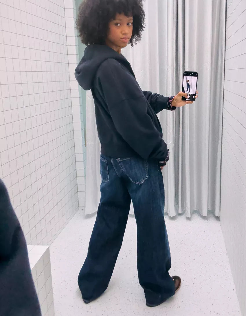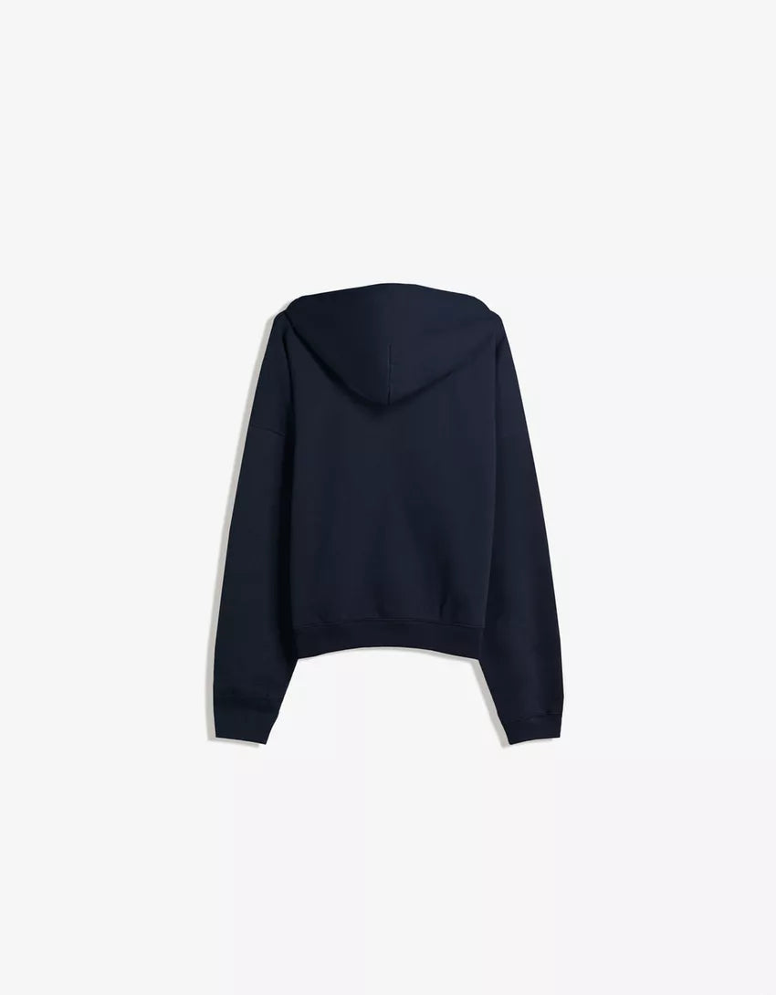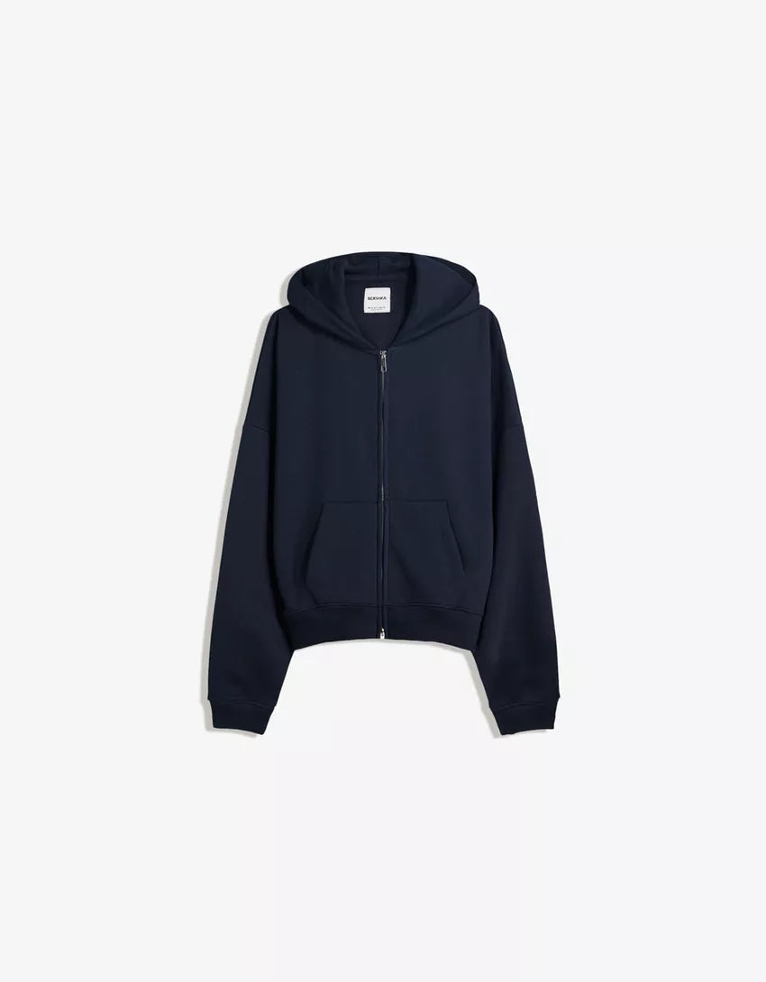 Oversize hooded sweatshirt with zipper. Available in navy, black, grey.