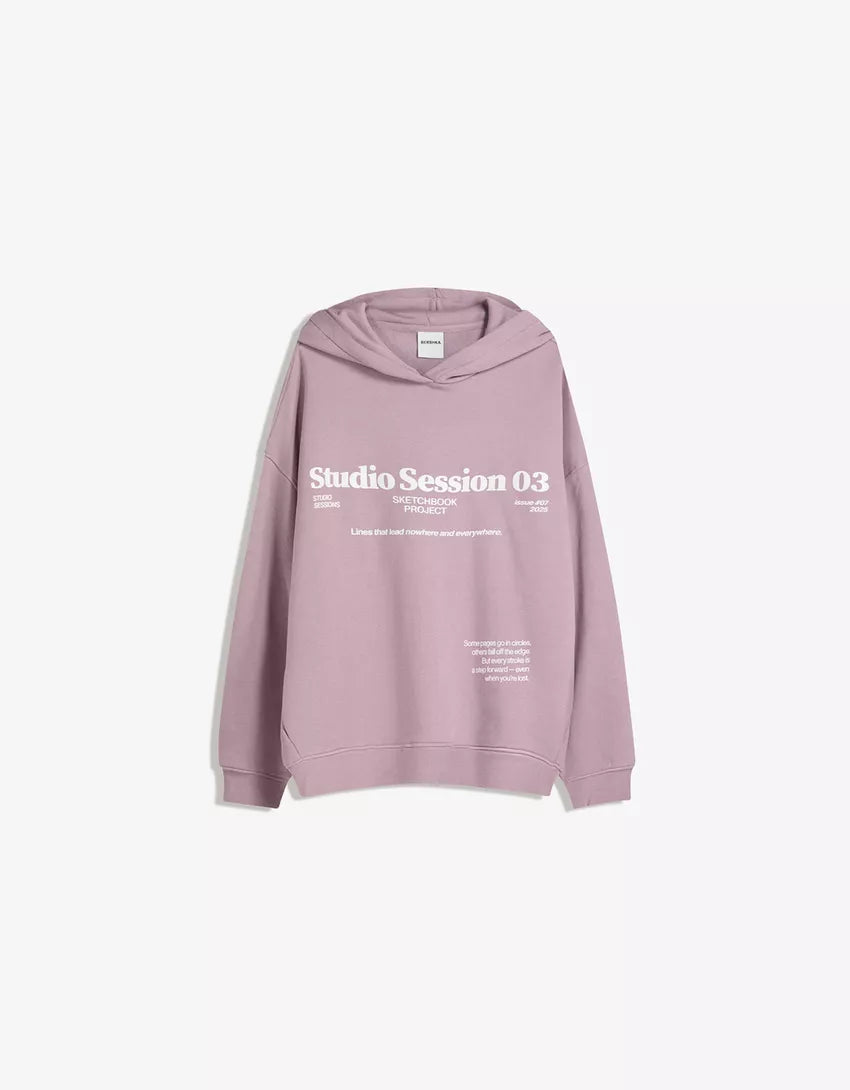 Printed hoodie. Available in violet, burgundy, off white, dark grey.