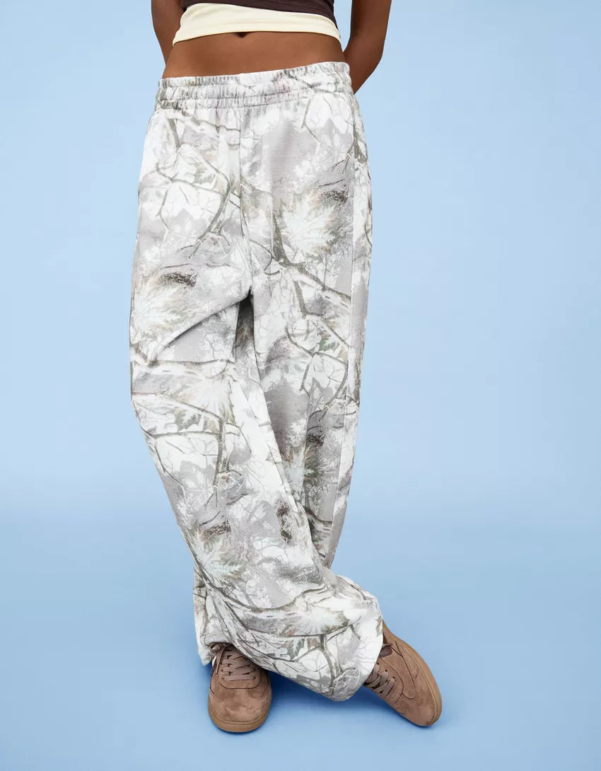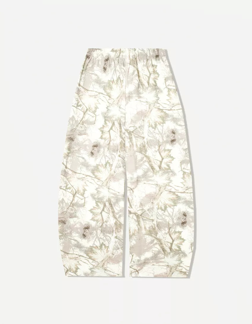 Printed plush barrel pants. Available in sand, dark grey.