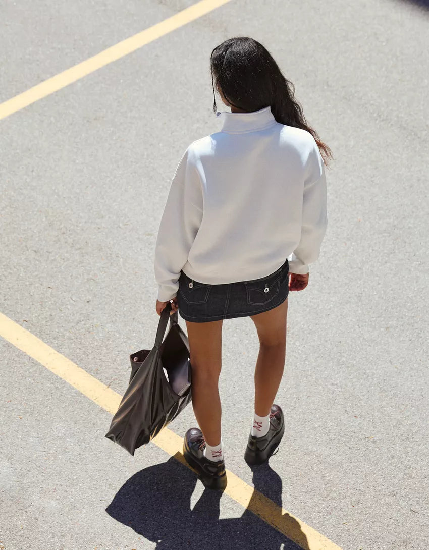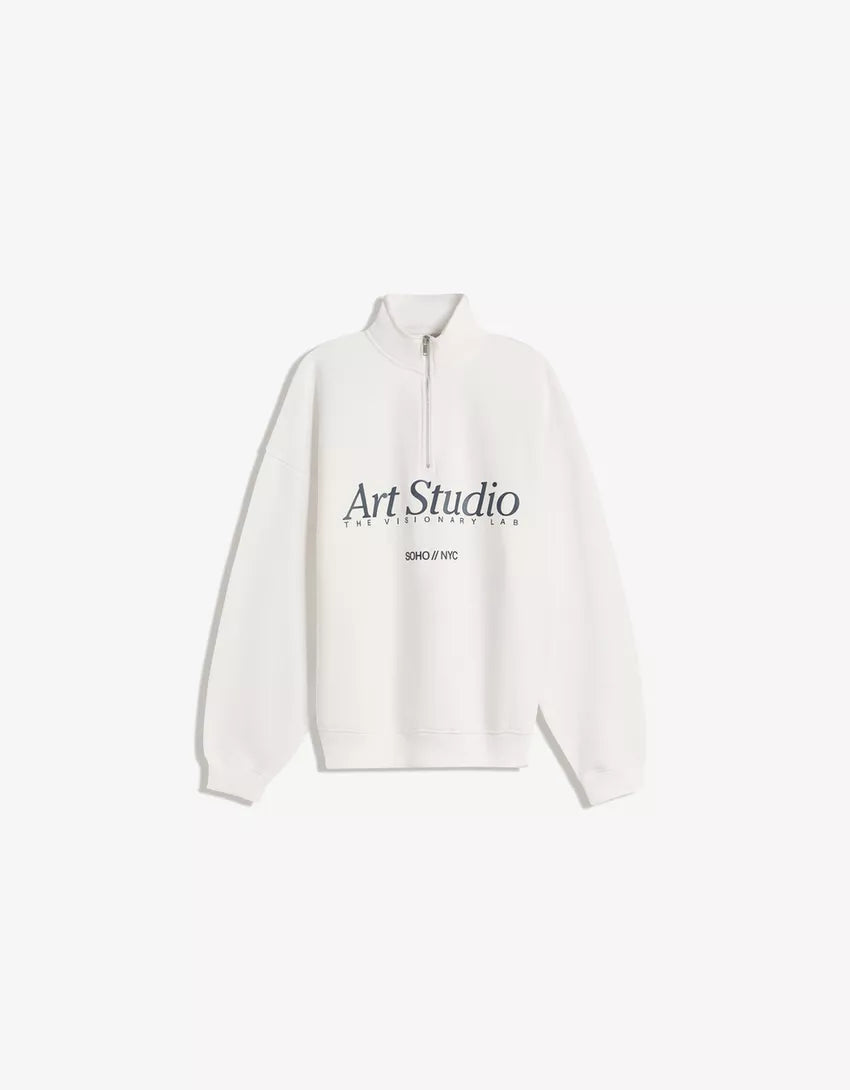 Printed zip-up neck sweatshirt. Available in white, brown.