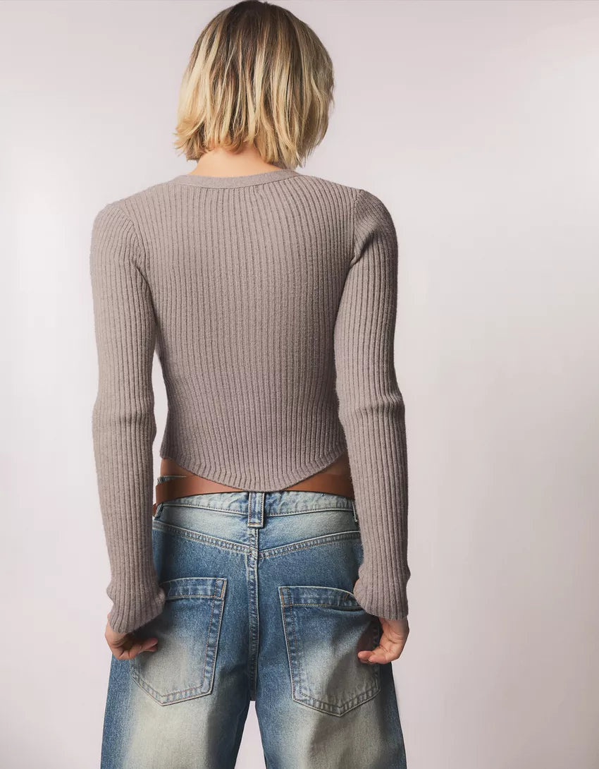 Ribbed cardigan. Available in sand, dark grey.