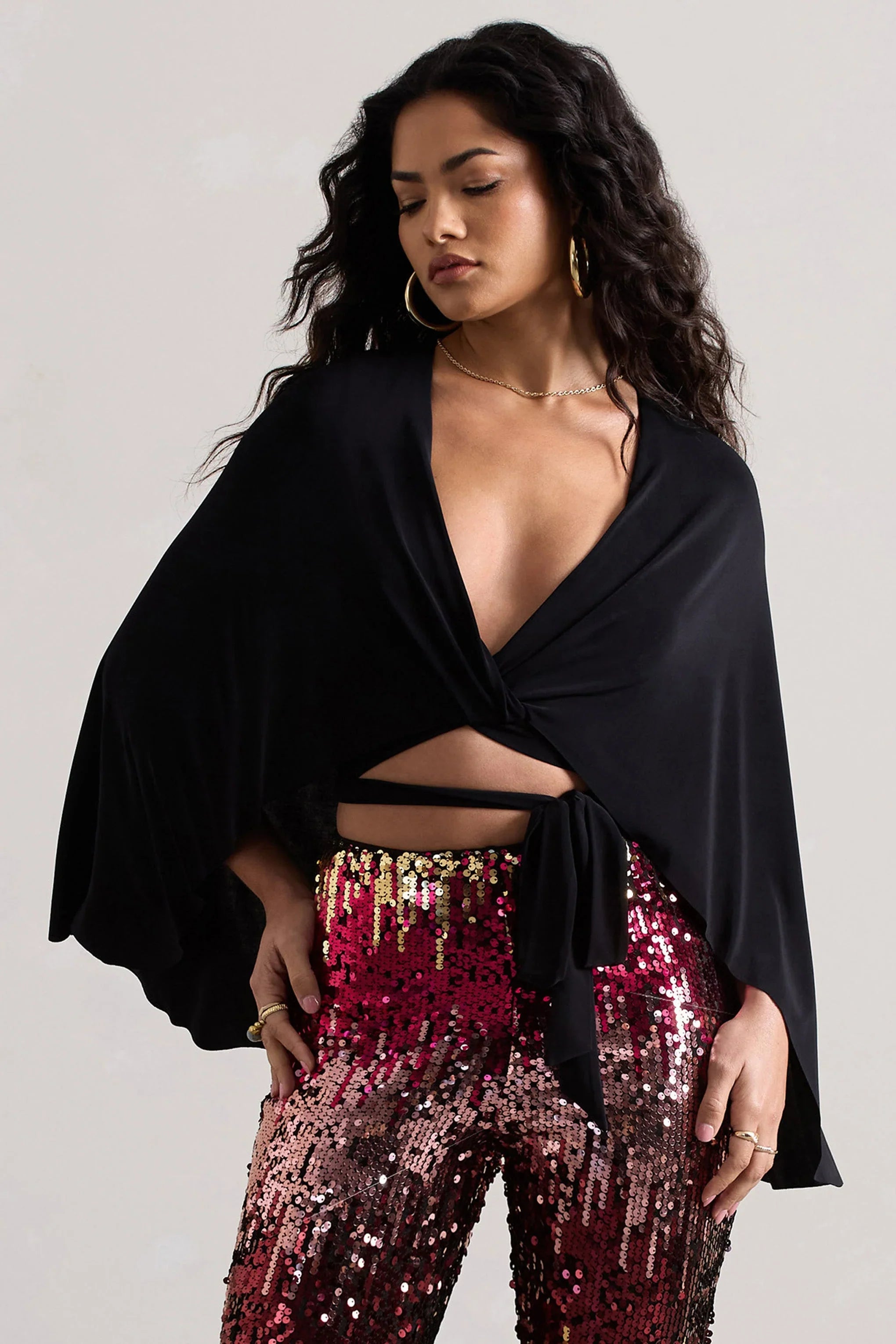 Look striking in Scorpio, our captivating black crop top for festival season. Arriving in a premium stretch jersey, Scorpio features a plunging neckline with a twisted wrap waist and flowing cape that creates effortless movement. Style yours with our Carnival trousers to get that ultimate festival glam.