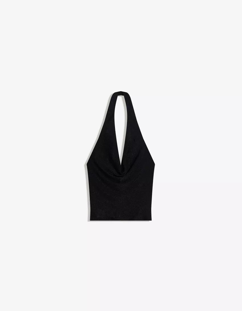 Shimmery draped cowl neck halter top. Available in black, navy, gold.