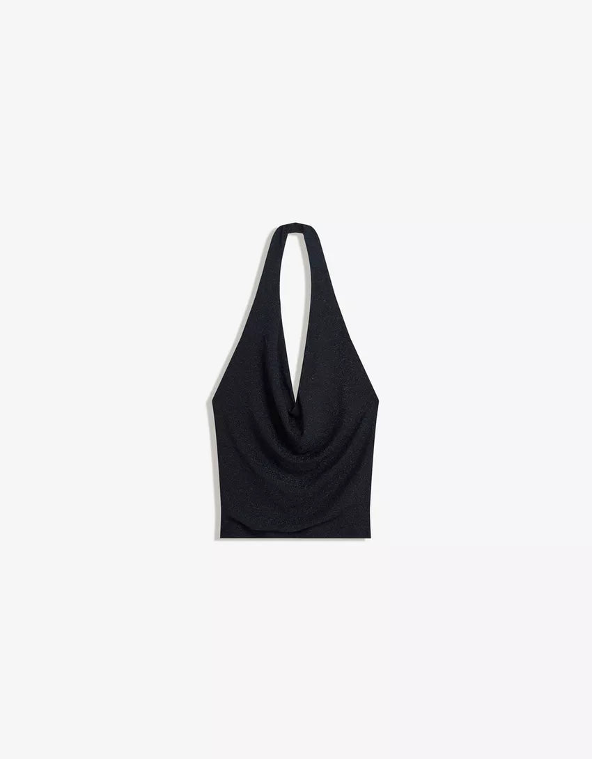 Shimmery draped cowl neck halter top. Available in navy, gold, black.