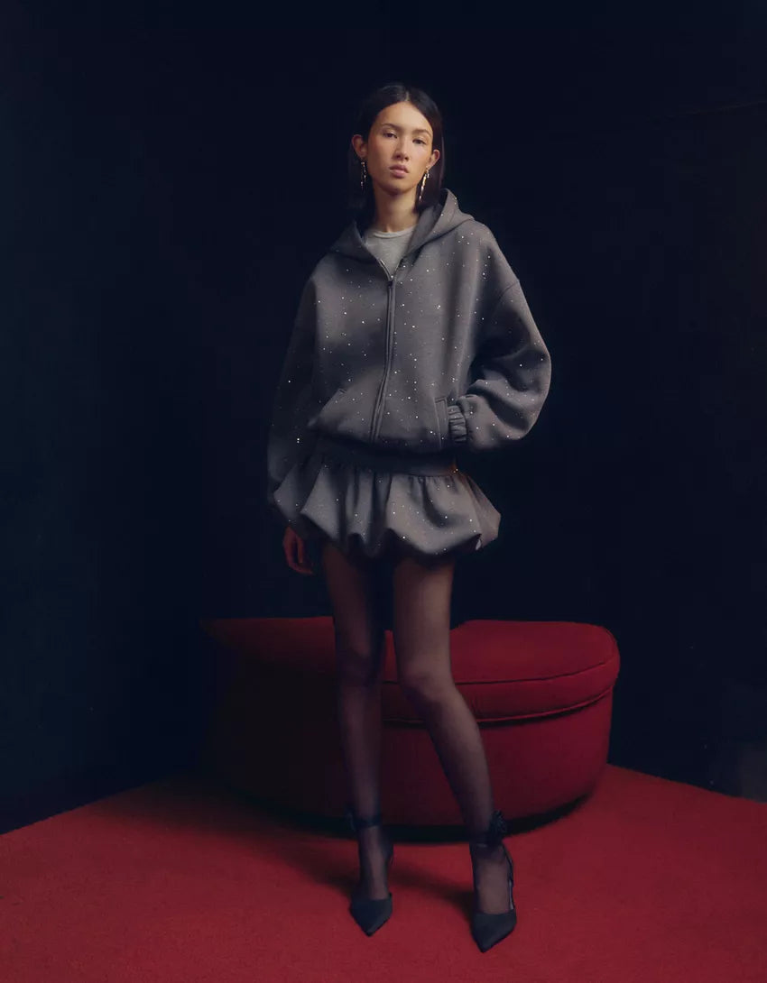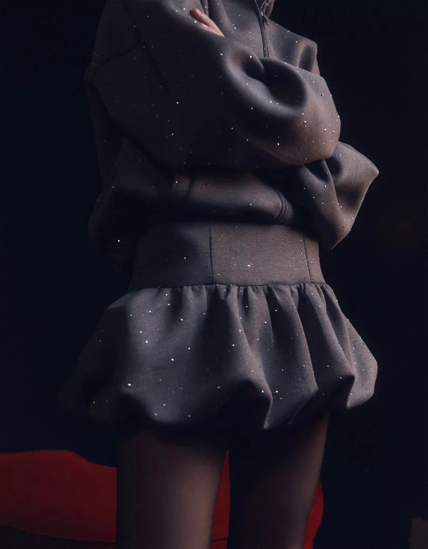 Shiny neoprene-effect mini skirt. Available in dark grey.