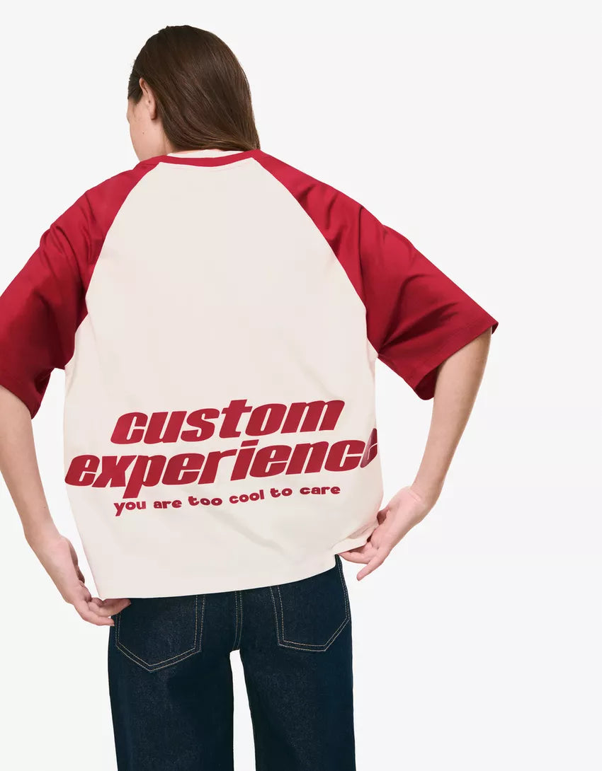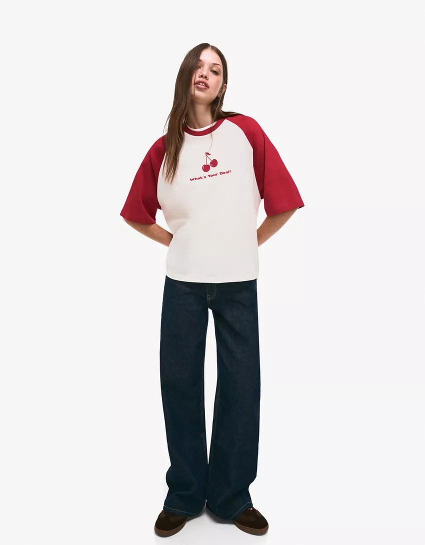 Short sleeve T-shirt with print. Available in red, navy.