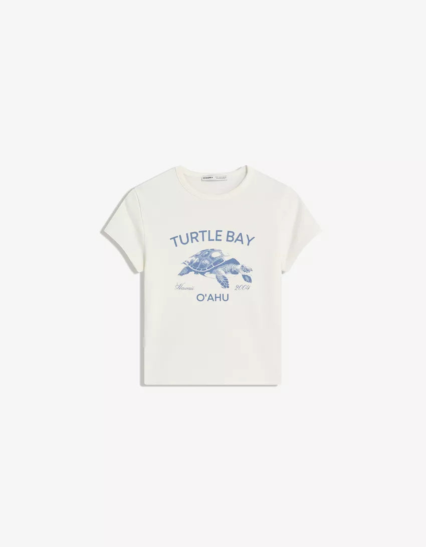 Short sleeve T-shirt with print. Available in off white, dark blue, light blue, white, yellow.