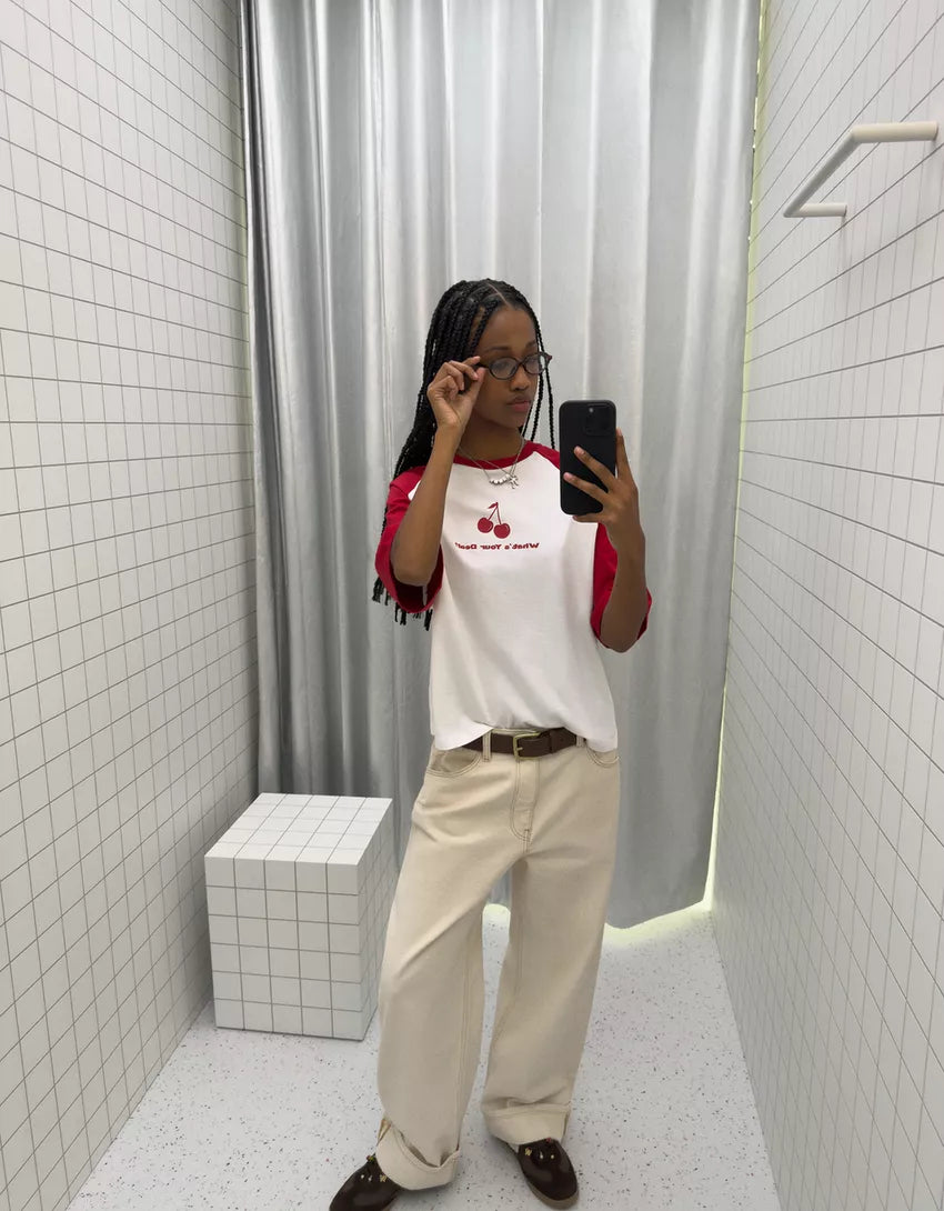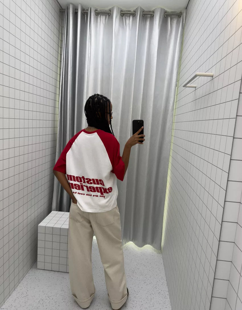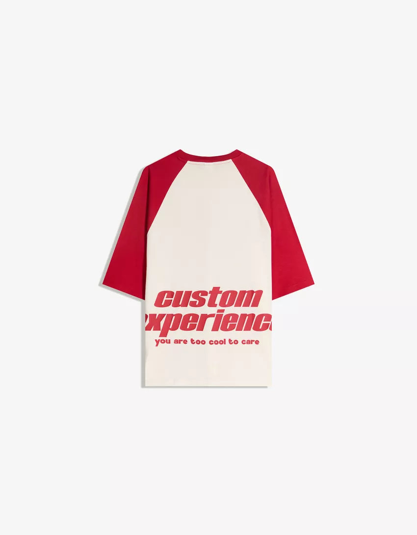 Short sleeve T-shirt with print. Available in red, navy.