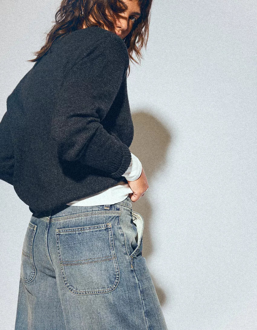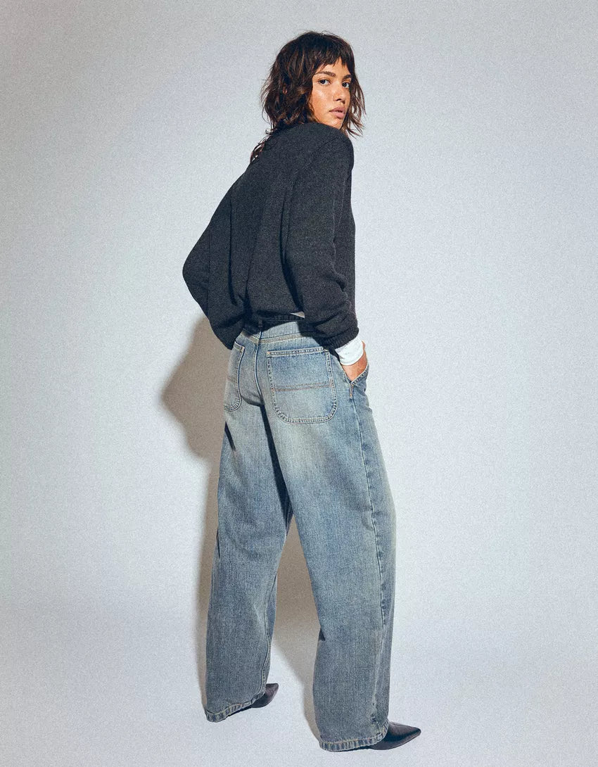 Skater-fit baggy jeans. Available in light blue, dark grey, grey.