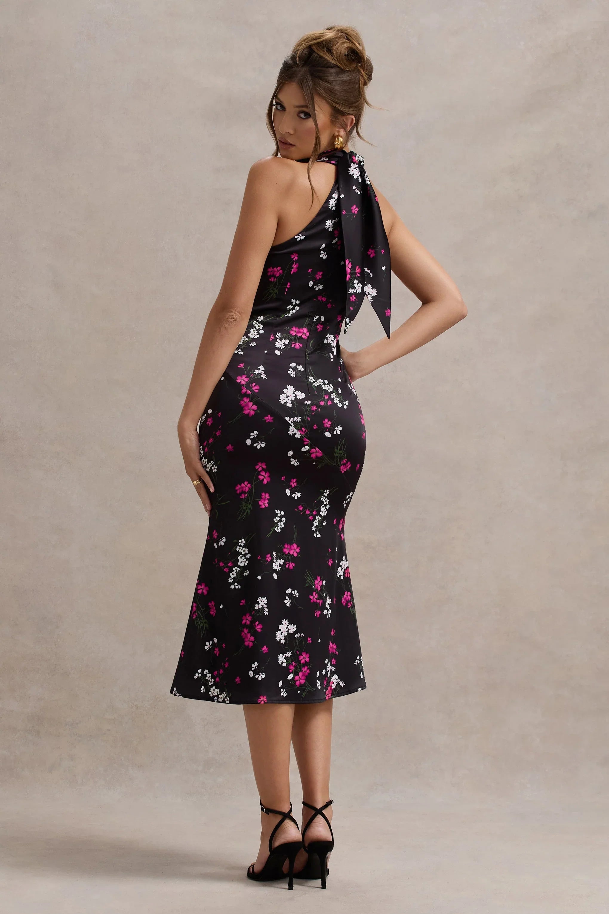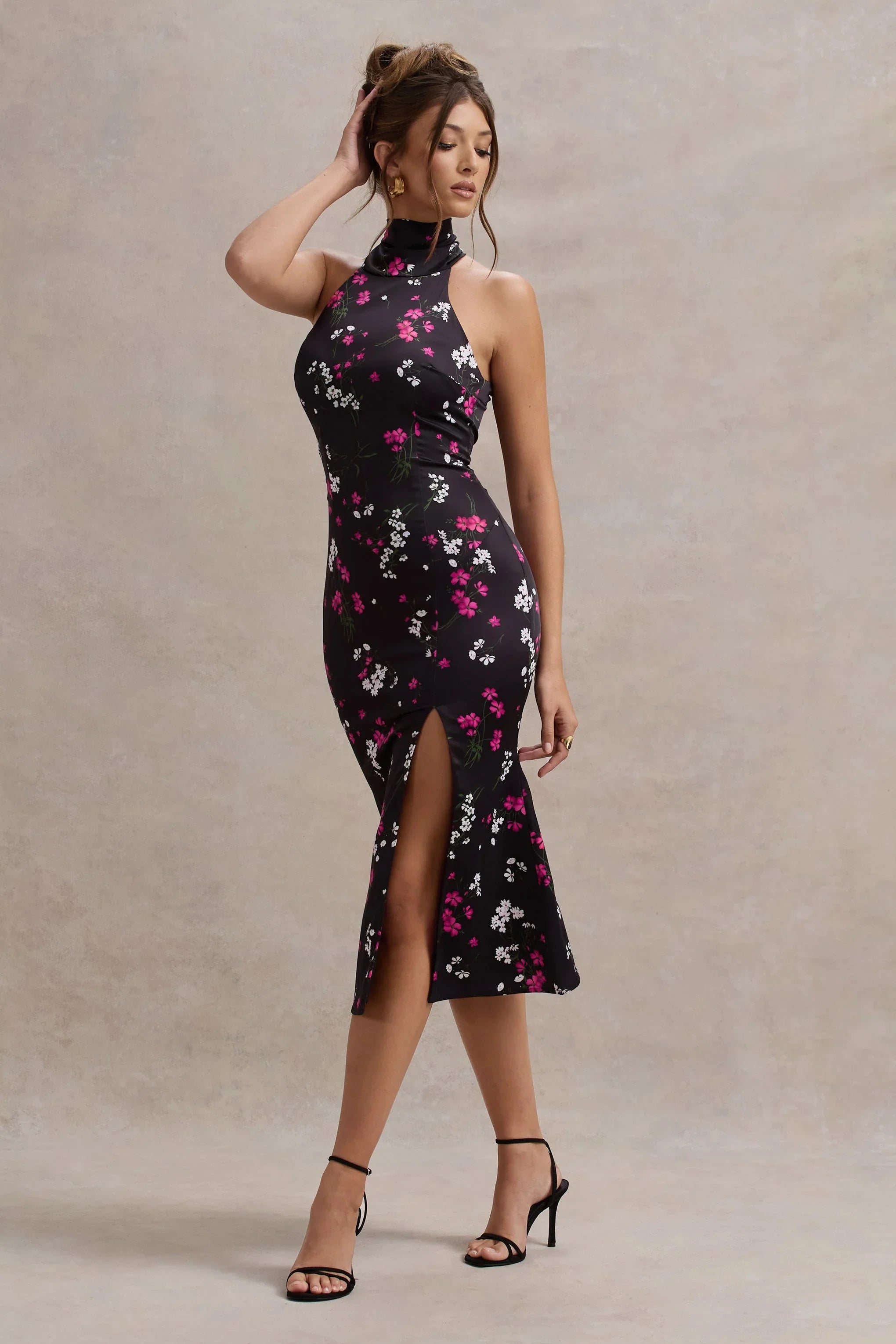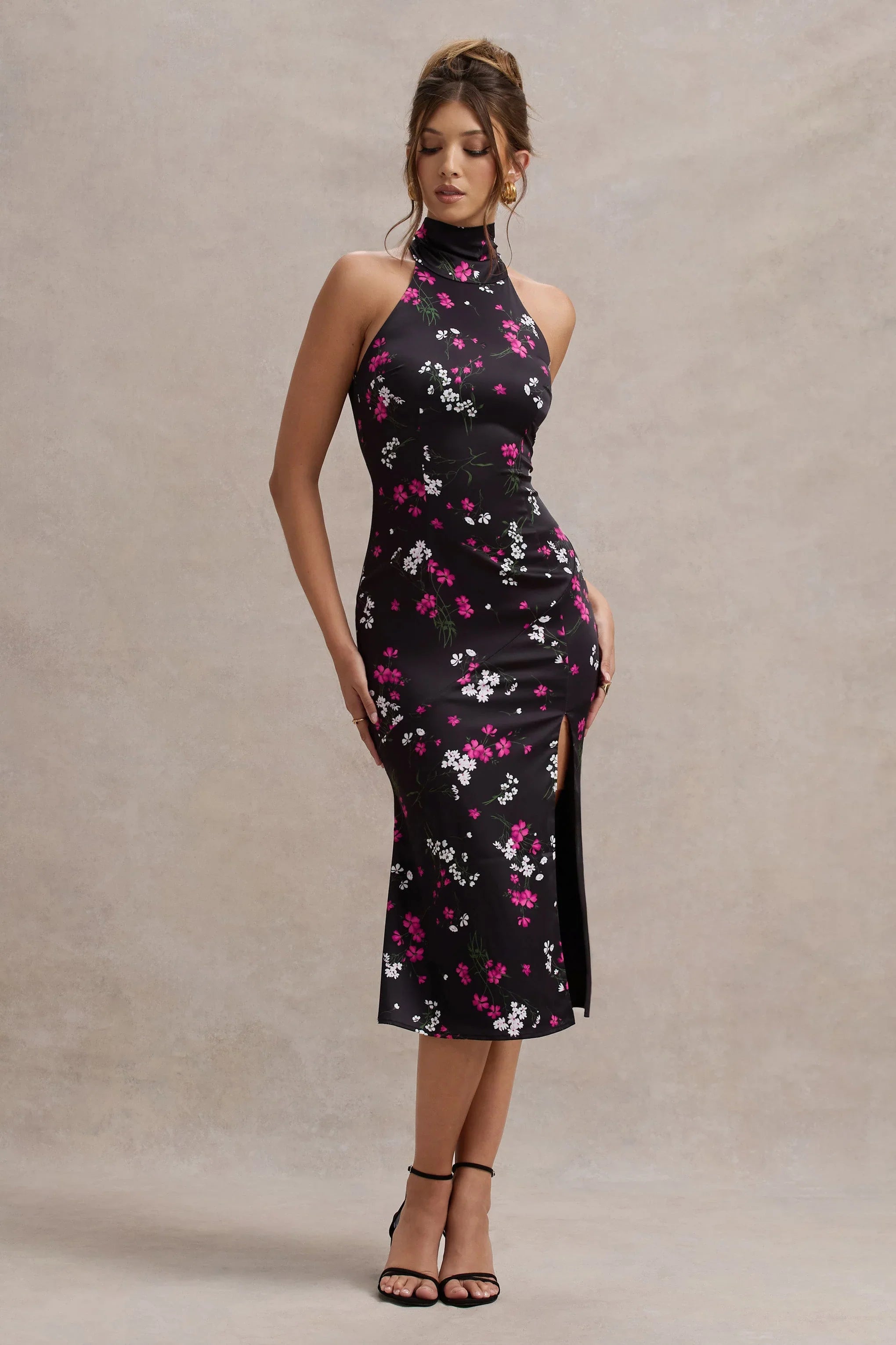 The perfect preppy choice for any garden party Violette is here. Presented in a premium purple ditsy floral print stretch satin, the gorgeous midi dress displays a flattering high neckline and a high leg split. Styles yours with a bouncy sleek ponytail and bold gold accents to tie together this stunning look.