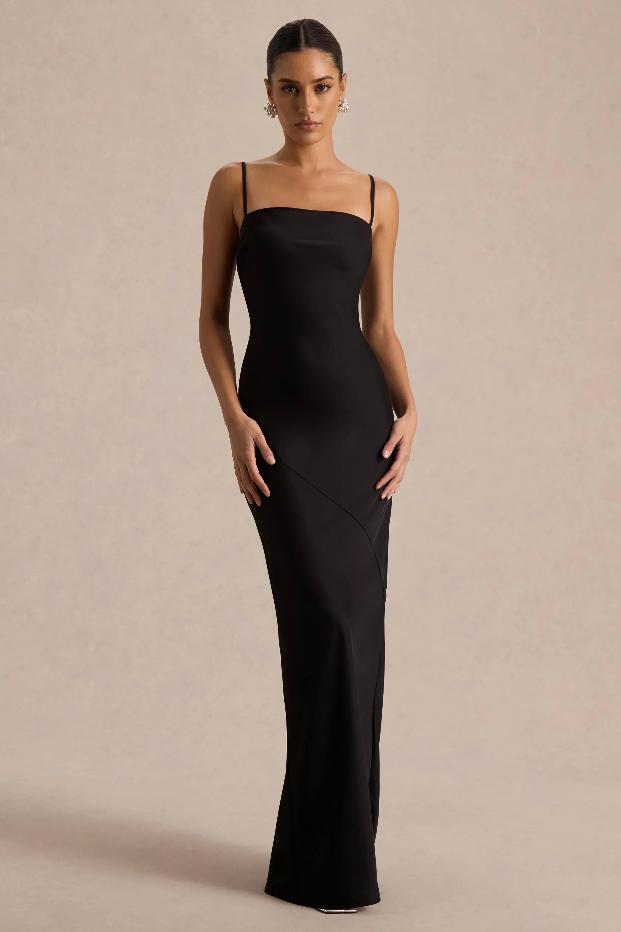 Introducing Yoli, a sleek take on modern glamour with a powerful edge. Cut from our premium black satin, this maxi dress flatters the figure with a smooth, elegant finish. The high neckline exudes sophistication, while the twisted cape overlay adds a striking twist. Finished with a centre-back split for movement, Yoli is a bold yet timeless choice for statement occasions.